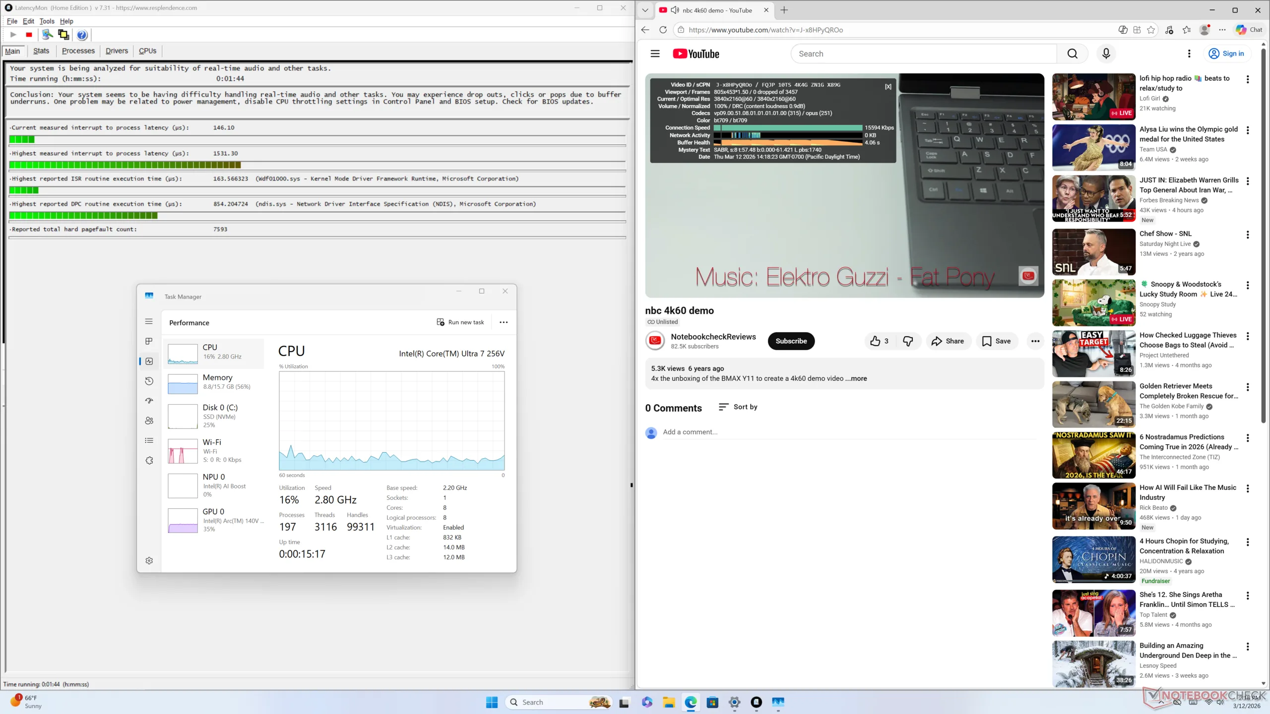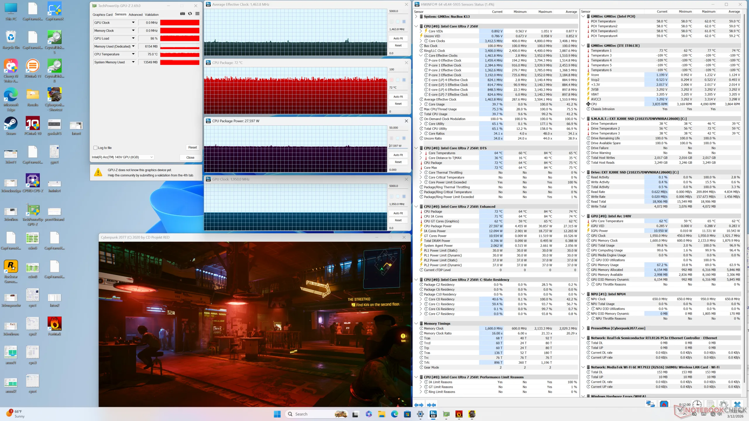 Lunar Lake-V is extreem efficiënt, zoals blijkt uit de onderstaande tabellen. Het systeem verbruikt gemiddeld slechts 32 W wanneer Cyberpunk 2077 wordt uitgevoerd, vergeleken met 86 W op de NucBox K12 die wordt aangedreven door de Radeon 780M. Deze laatste mag dan wel sneller zijn, hij is zeker niet 2x of 3x zo snel als onze Intel-oplossing.