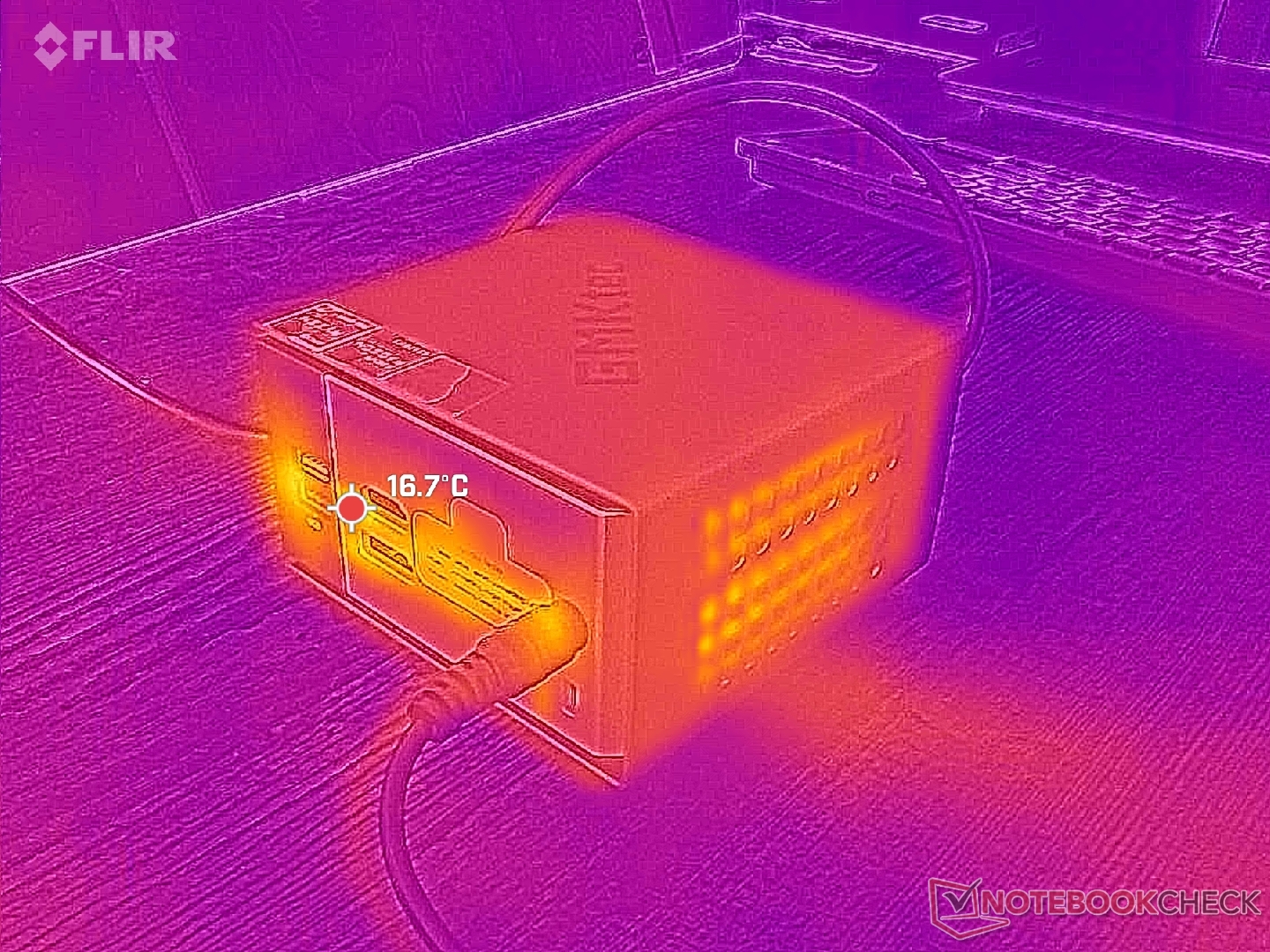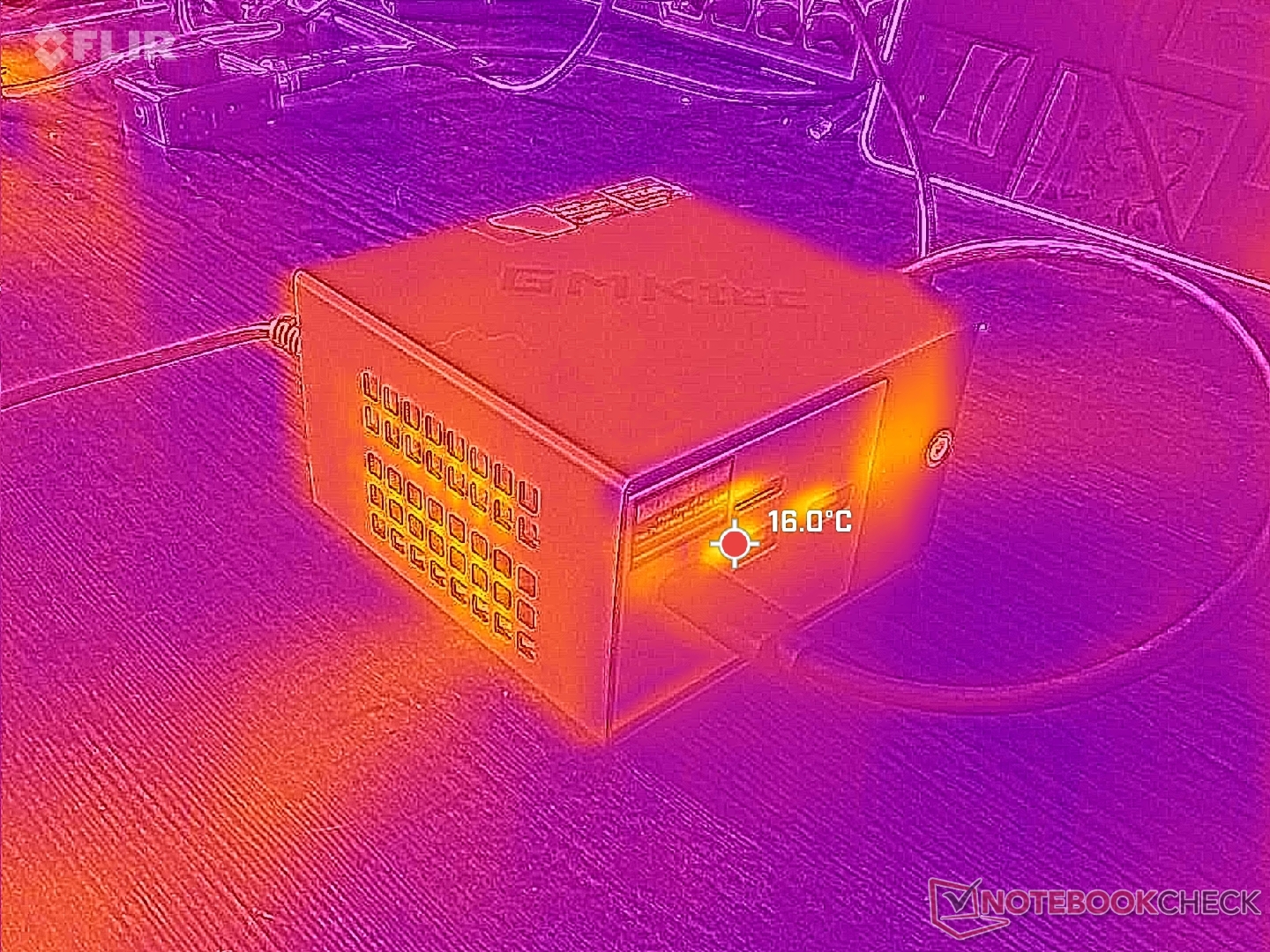 Verse lucht komt binnen via sleuven langs de bovenrand van het apparaat voordat het via de twee zijkanten van het apparaat naar buiten gaat. Bij de meeste andere mini PC-ontwerpen komt de afvalwarmte daarentegen via de achterkant naar buiten. Als de NucBox K16 op zijn kant zou worden geplaatst, zouden de uitlaatroosters worden afgedekt en de temperatuur en prestaties mogelijk worden beïnvloed.