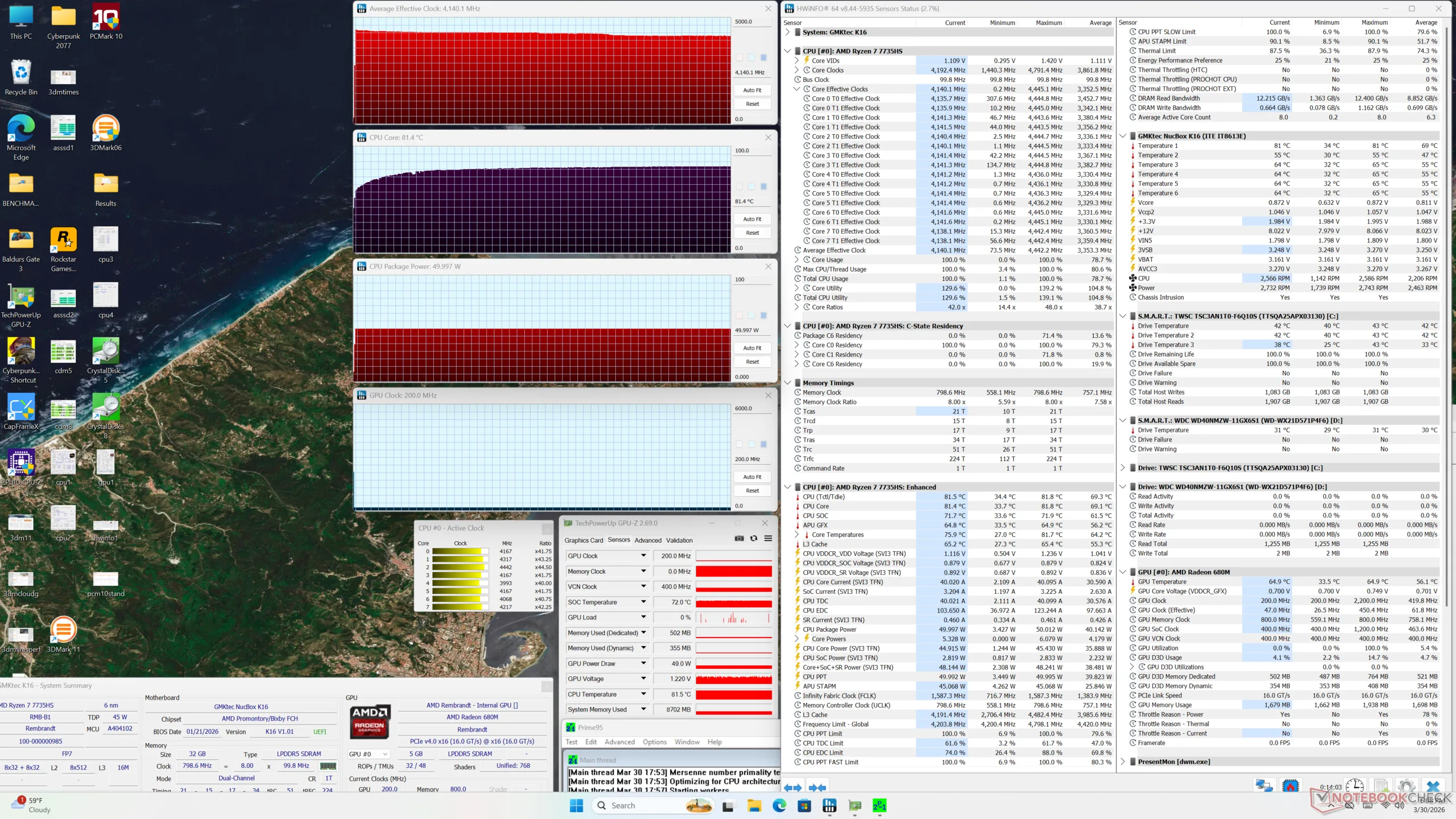 De CPU stabiliseerde op 4,1 GHz, 50 W en 81 C tijdens het uitvoeren van Prime95 stress, wat eigenlijk warmer is dan wat we registreerden op de EVO-X1 met de nieuwere en snellere Zen 5 CPU. De kerntemperatuur bleef ook een paar graden warmer tijdens het spelen van games. De NucBox K13 met de efficiëntere Core Ultra 7 256V biedt zowel snellere gamingprestaties als een koelere draaitemperatuur.