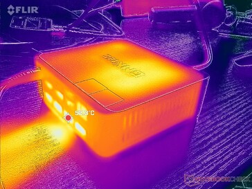 De oppervlaktetemperaturen aan de bovenkant van het apparaat kunnen oplopen tot meer dan 36 C wanneer zware belastingen zoals games worden uitgevoerd. Afvalwarmte ontsnapt via de achterkant, zoals te zien is op de onderstaande temperatuurkaarten.