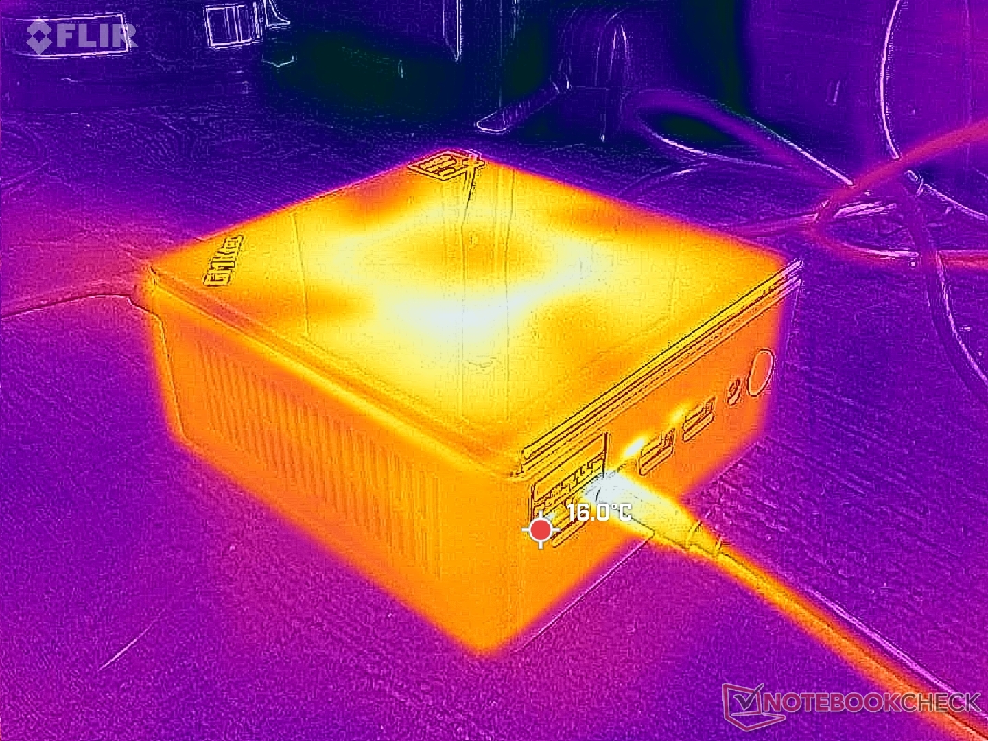 De twee interne ventilatoren draaien nooit stationair, zelfs niet als u op uw bureaublad zit zonder toepassingen te draaien. Het geluid van de ventilator is een hoorbare 37 dB(A) tijdens het surfen op het web, vergeleken met ruim onder de 30 dB(A) op de Beelink SER9 of net boven de 30 dB(A) op de MSI Cubi NUC M1, zelfs wanneer deze op Power Saver-modus is ingesteld. De ventilatorprofielcurve kan in dit opzicht zeker verbeterd worden.