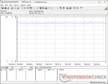 We kunnen een maximaal stroomverbruik van 90 W uit de middelgrote (13,2 x 5,8 x 3,2 cm) 120 W AC-adapter noteren wanneer de CPU voor 100% belast wordt.