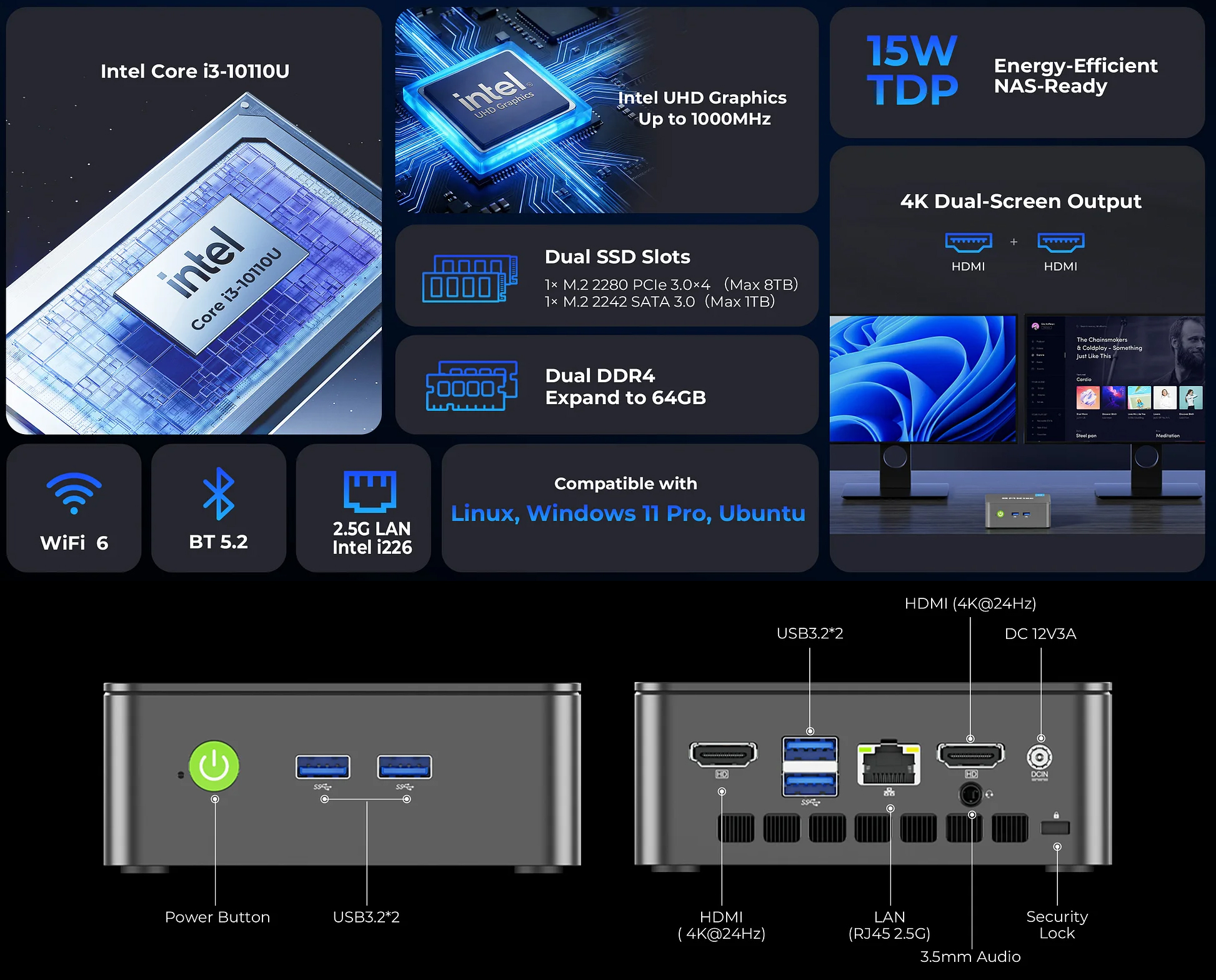 Onder de motorkap heeft de GMK NucBox G3 Pro de Intel Core i3 10110U. Het is een dual-core processor uit de Comet Lake line-up, en hij kan gekoppeld worden aan maximaal 64GB DDR4 RAM via de twee SO-DIMM slots. Er zijn twee M.2-sleuven die in totaal tot 9TB opslagruimte kunnen bevatten (2 TB Silicon Power Gen 3 momenteel $ 249,97 op Amazon).