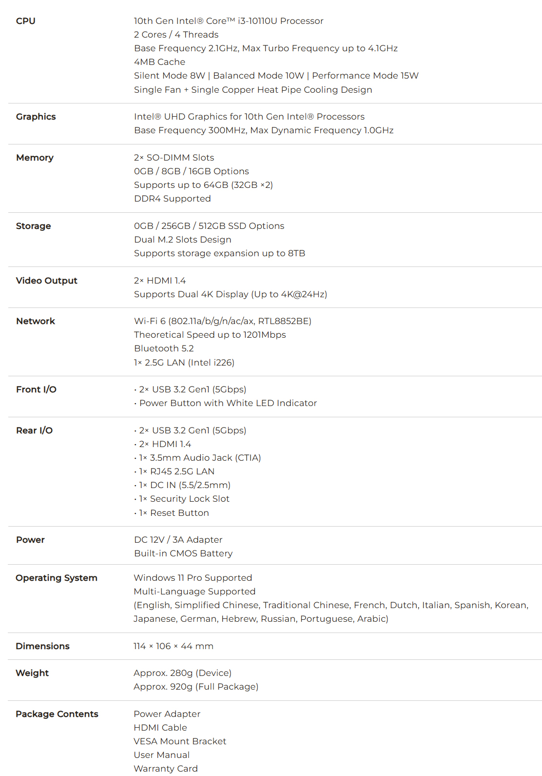 Verder is er Bluetooth 5.2 en dual-band WiFi 6 voor draadloze connectiviteit. De NucBox G3 Pro heeft ook een relatief compacte vormfactor, en er is ondersteuning voor VESA-montage. Bekijk het specificatieblad hieronder voor meer informatie over de mini PC.