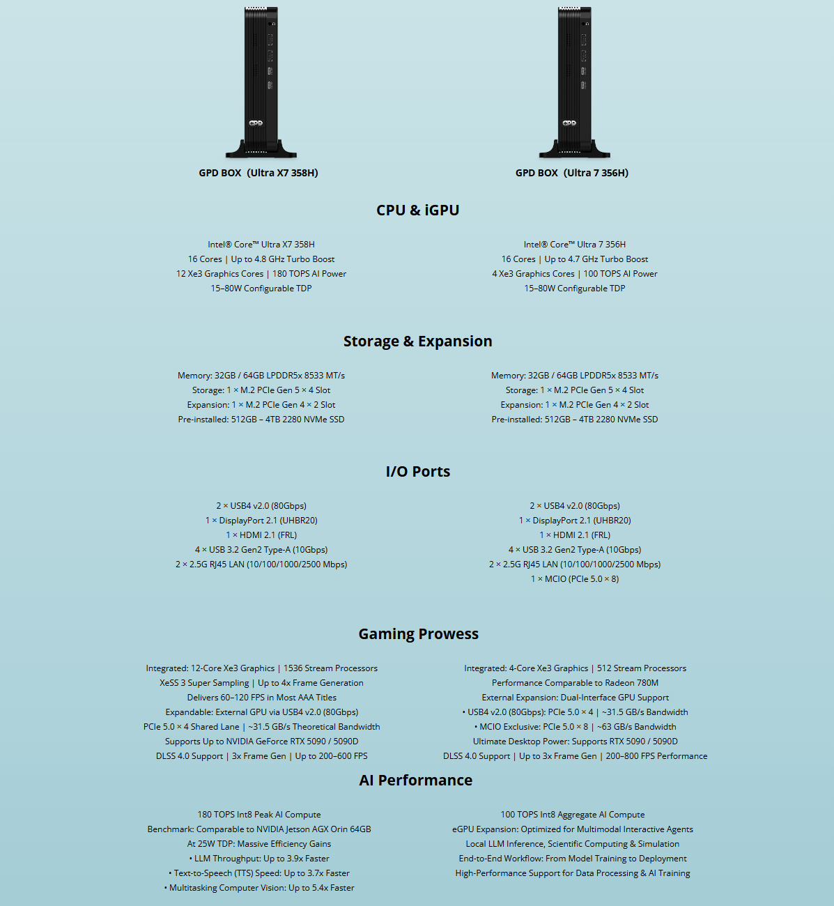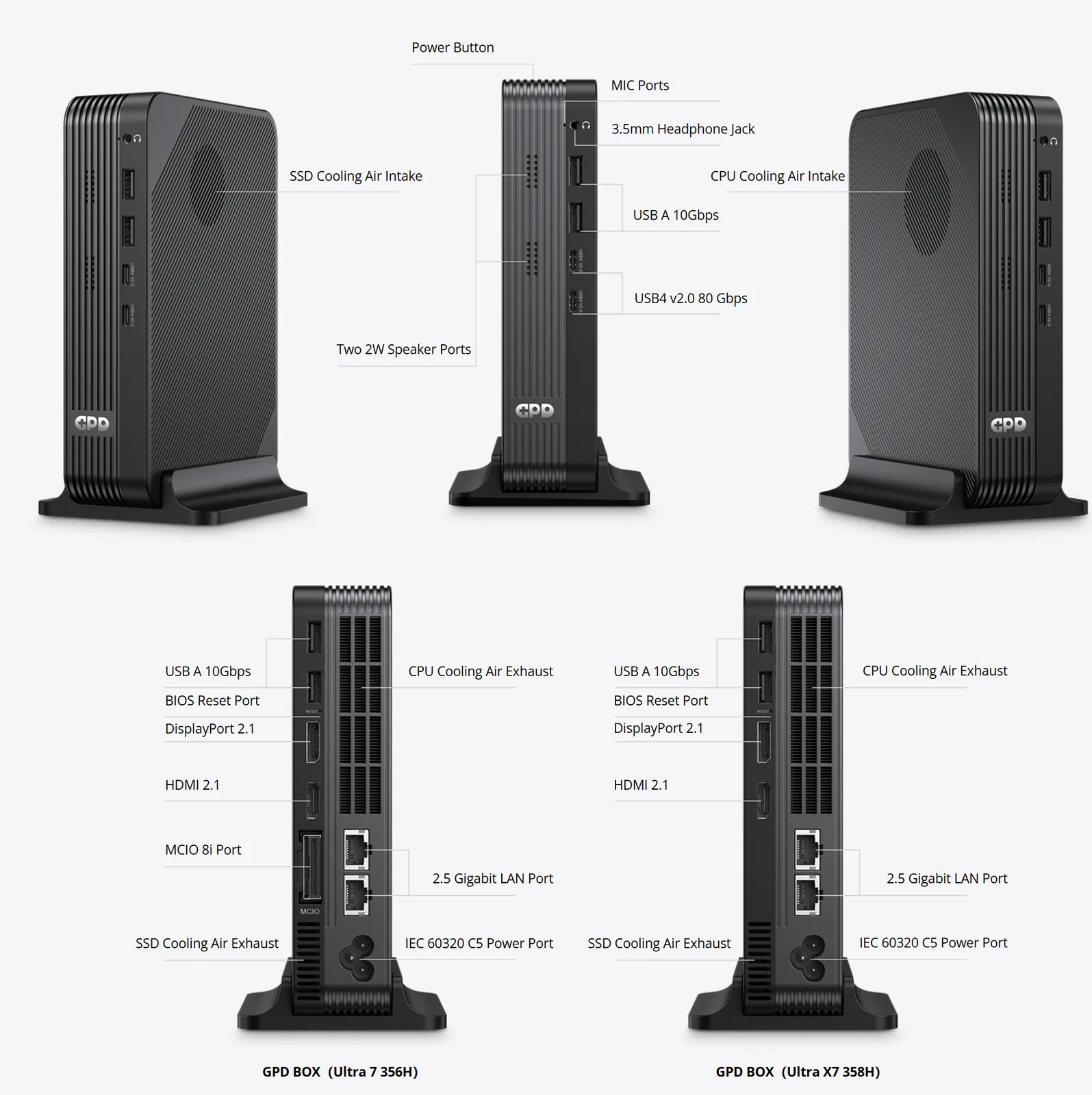 Nu heeft het bedrijf meer specificaties van de GPD Box gedeeld. Het bedrijf bevestigt dat de mini-PC aangedreven zal worden door de Intel Panther Lake CPU's. Er zijn twee opties beschikbaar: één met de Intel Core Ultra X7 358H en de andere met de Core Ultra 7 356H.