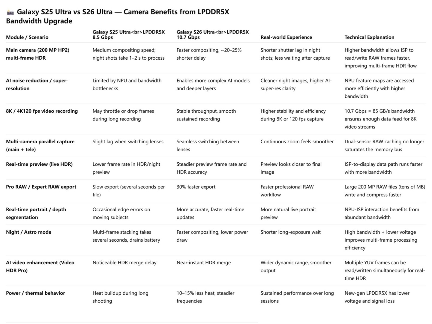 Dit zijn dezelfde RAM-configuraties als de Galaxy S25-serie, maar er zijn geen 128 GB opslagopties meer. Het lijkt erop dat Samsung heeft besloten de RAM-capaciteit voor de Galaxy S26-serie niet te verhogen. Dat gezegd hebbende, dezelfde leaker had vorige week vermeld dat LPDDR5X-geheugen op hogere snelheden van 10,7 Gbps draait, vergeleken met 8,5 Gbps op de huidige generatie. Dit zal een snellere verwerking van nachtfoto's, minder ruis in foto's met weinig licht, een beter dynamisch bereik in Pro-video en enkele andere cameraverbeteringen mogelijk maken.