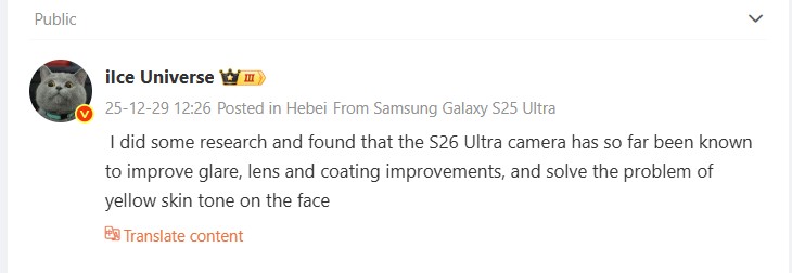 De verbeterde 3x telefoto camera is uitgerust met de enige nieuwe sensor, en zelfs dat zou veel klanten kunnen teleurstellen, zoals Ice Universe al maanden benadrukt. Desalniettemin kan Samsung nog steeds zinvolle verbeteringen aanbrengen in de quad-camera van de Galaxy S26 Ultra, zoals een recent bericht op Weibo suggereert suggereert. Volgens eerdere aanwijzingen lijkt de aanzienlijk helderdere optiek van het aankomende vlaggenschip een verbeterde coating te krijgen om artefacten zoals lensflares te verminderen. Samsung lijkt een voorbeeld te nemen aan Vivo of Sony, die voor dit doel gebruikmaken van Zeiss T*-coating.