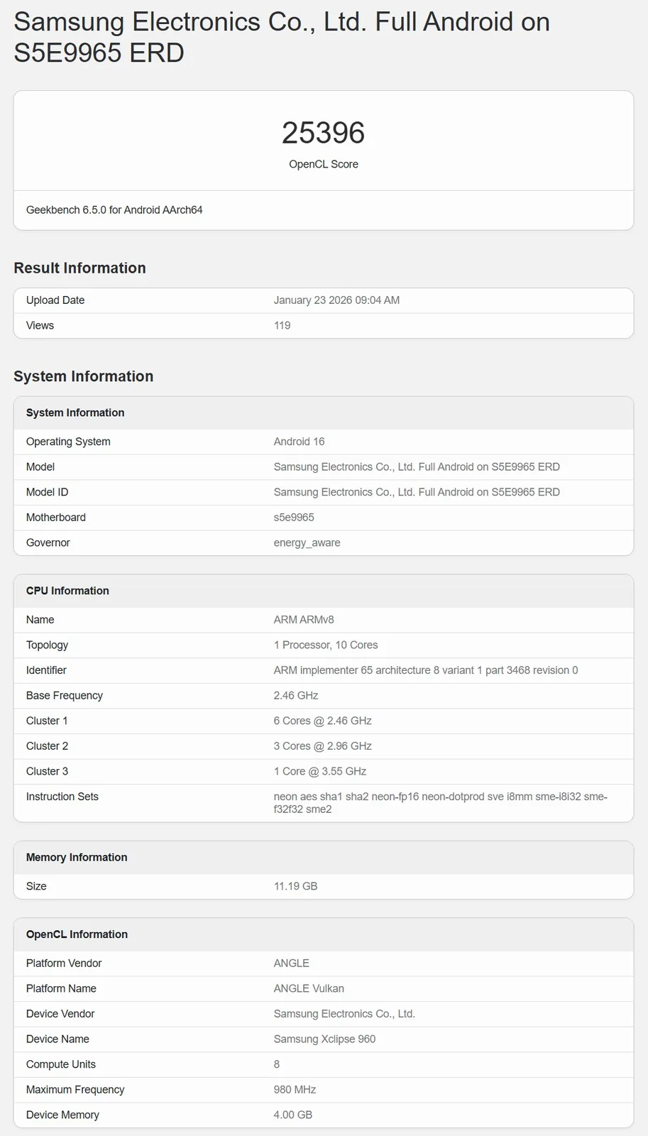 Niet alleen de GPU-configuratie van dit potentiële Exynos 2700 prototype is ongebruikelijk, maar dat geldt ook voor de CPU, die wederom een deca-core blijkt te zijn, zij het met een zeer ongebruikelijke 1-4-1-4 clusterconfiguratie. De klokfrequenties van 2,3 GHz, 2,4 GHz, 2,78 GHz en 2,88 GHz zijn waarschijnlijk verre van definitief en erg laag. In de Exynos 2600 draait de belangrijkste kern op 3,8 GHz (3,55 GHz in het testsysteem hierboven). We weten nog niet welke ARM-kernen hier gebruikt zullen worden; vermoedelijk wordt het een opvolger van de ARM Lumex architectuur die vorig jaar werd geïntroduceerd en die momenteel wordt gebruikt in de Exynos 2600 voor de Galaxy S26 en Galaxy S26+. Net als de Exynos 2600 zal de Exynos 2700 waarschijnlijk ook een 2nm-chipset zijn en mogelijk bedoeld zijn voor de Galaxy S27 en Galaxy S27+ in sommige regio's.