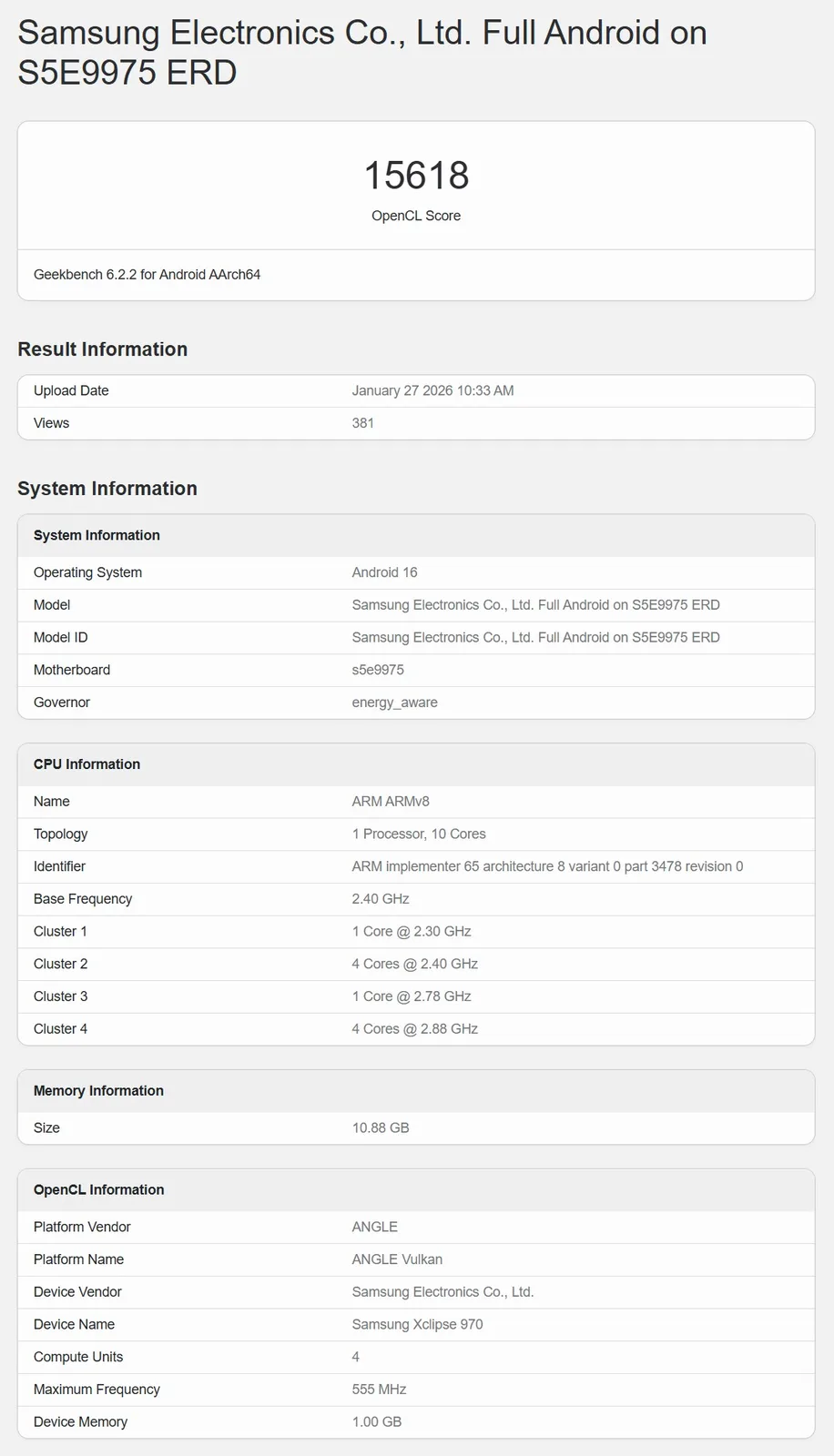 Als het model met het nummer S5E9975 ERD inderdaad een testsysteem van Samsung is voor de opvolger van de Exynos 2600dan presteert het momenteel erg slecht. Hier zijn de prestaties van de GPU gemeten, die zoals verwacht een Samsung Xclipse 970 is en volgens Geekbench is uitgerust met 4 rekeneenheden met een kloksnelheid van 555 MHz. Dat is ongeveer half zo veel en half zo snel als het Exynos 2600 testsysteem, dat al meerdere keren de heeft gehaald op Geekbench meerdere keren heeft gehaald. Gezien het feit dat de GPU maar half zo krachtig is, is het resultaat van 15.618 punten in de OpenCL test niet slecht, maar natuurlijk nog steeds aanzienlijk onder het niveau van het Exynos 2600 testsysteem