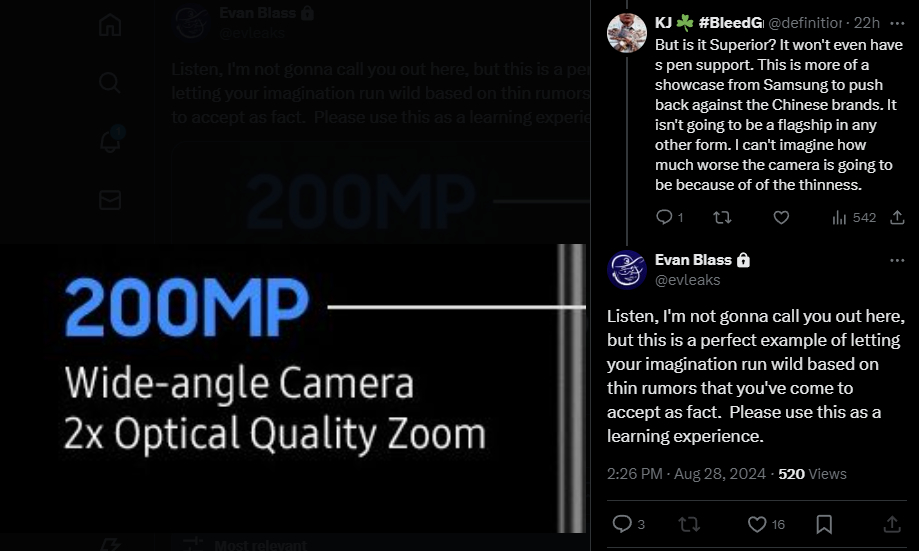 Vervolgens tweette Blass de afmetingen van de Galaxy Z Fold Special Edition, die overeenkomen met eerdere verwachtingen dat het toestel dunner maar breder zou zijn dan de Galaxy Z Fold6. Bovendien heeft hij nu de speculatie aangewakkerd dat de Z Fold "een grote cameraboost zou kunnen krijgen" die beschouwd moet worden als 'top-of-the-line' en mogelijk 'kan evenaren' de Galaxy S24 Ultra. Blass deelde een afbeelding die kan worden beschouwd als de Galaxy Z Fold Special Edition met een 200 MP primaire camera.
