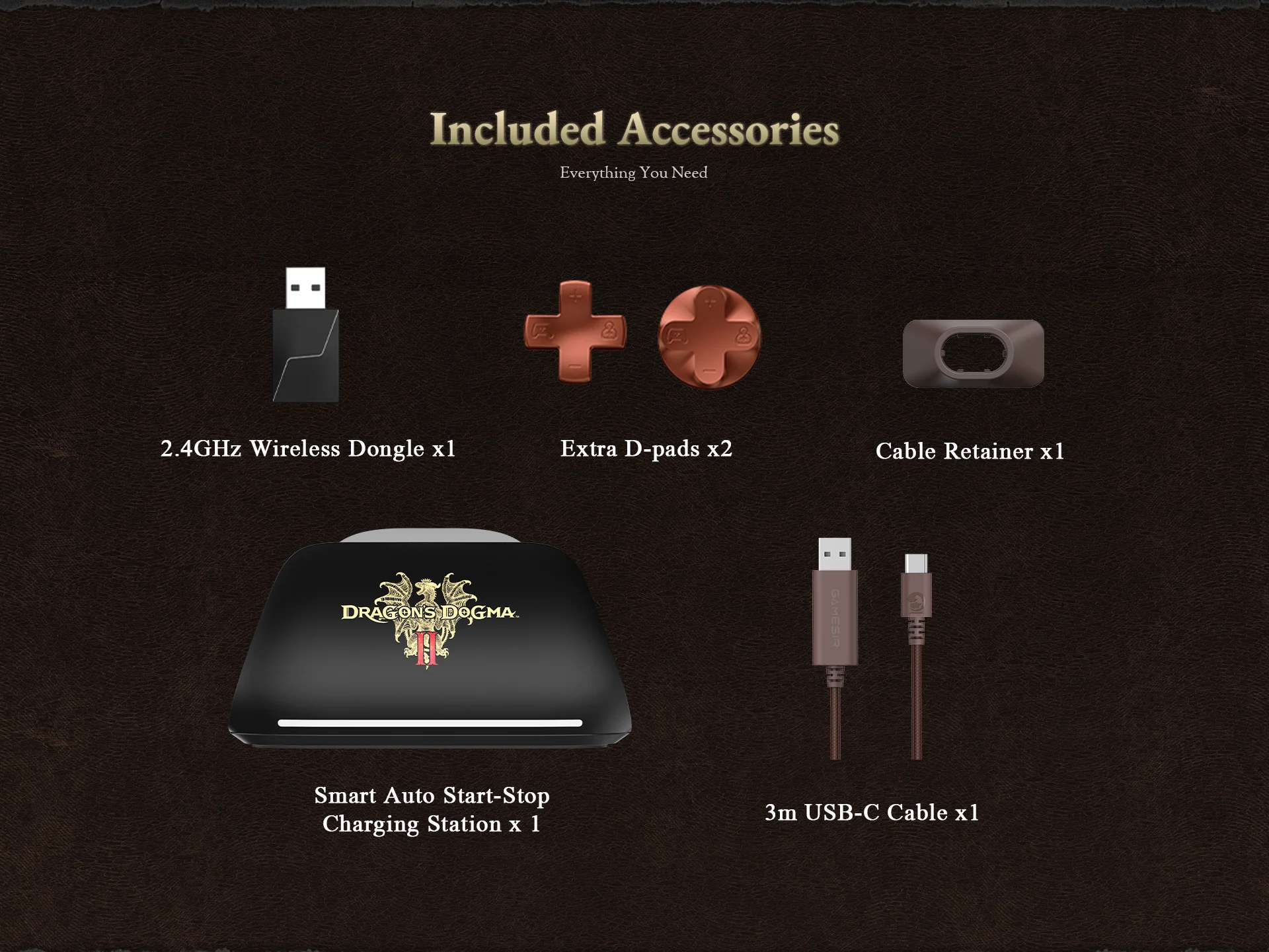 Naast de controller en het oplaaddock krijgen kopers ook een 2,4GHz draadloze dongle, twee extra D-Pads met verschillende ontwerpen, een kabelhouder en een 3 meter lange USB-C naar USB-A gevlochten kabel.
