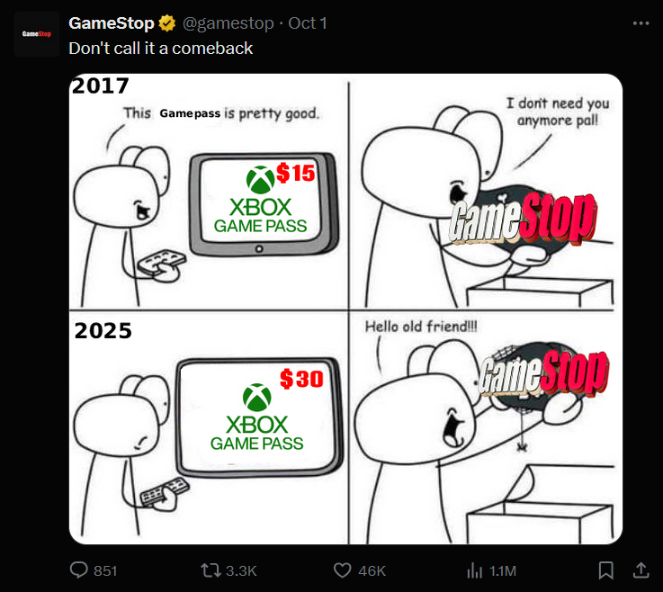 Het sociale mediateam van GameStop verspilde geen tijd, plaatste memes op X waarin de prijsstijging belachelijk werd gemaakt, terwijl erop werd gewezen dat de Game Pass Ultimate-kaarten van $19,99 nog steeds in de winkel en online verkrijgbaar zijn. GameStop's bespotting van Microsoft, terwijl ze ook hun eigen kaarten promoten, kan worden gezien als behoorlijk effectieve marketing op een moment dat mensen zich extreem uitspreken over de prijswijziging.
