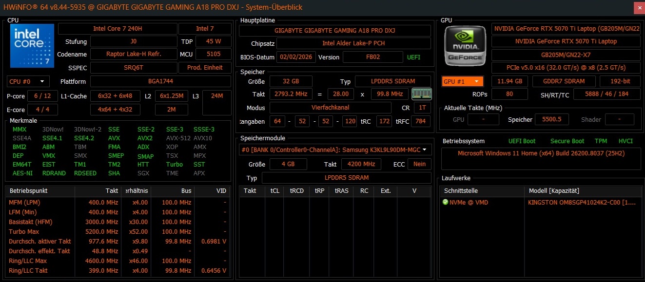 | Gigabyte Gaming A18 Pro Intel Core 7 240H ⎘ NVIDIA GeForce RTX 5070 Ti Laptop ⎘ 32 GB Geheugen, 1024 GB SSD | Catalogusprijs: 2399 EUR | 2.9 kg | 25 mm | 18.00" 2560x1600 168 PPI IPS | |