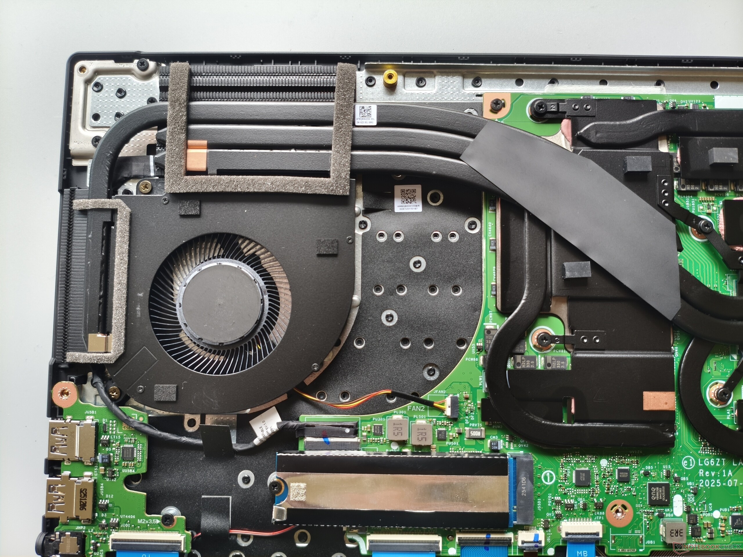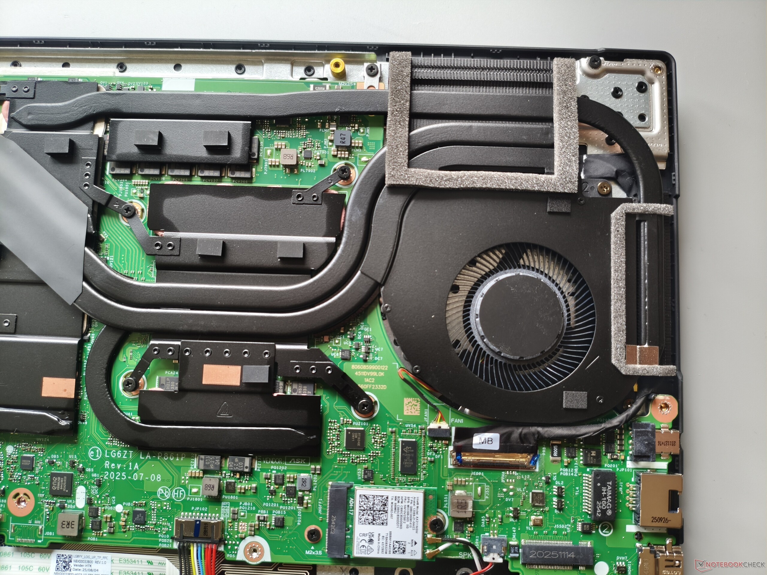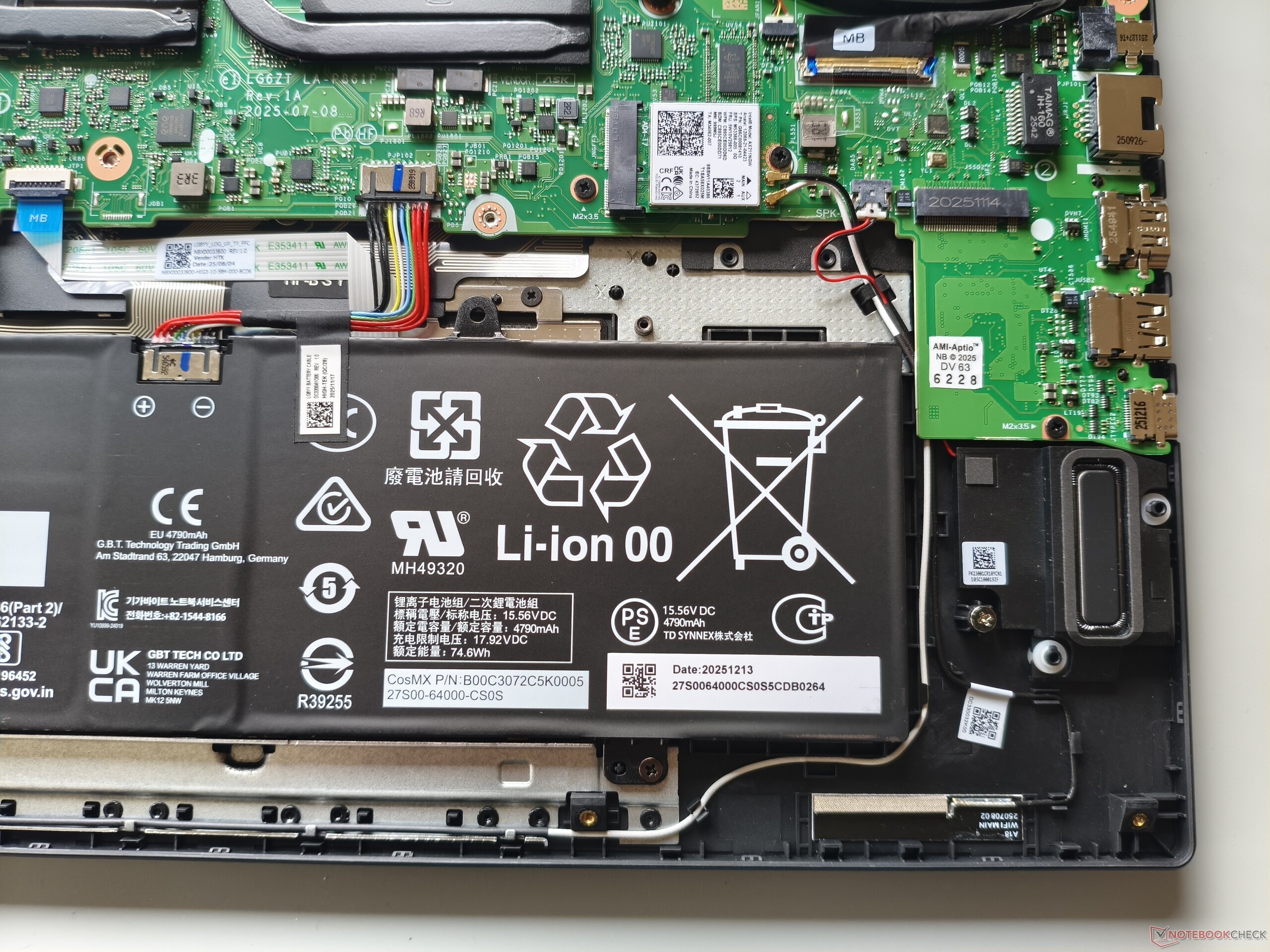 Het bodempaneel kan worden verwijderd na het losdraaien van 11 kruiskopschroeven. Daaronder wordt duidelijk dat er ruimte zou zijn geweest voor een grotere batterij. Twee M.2-sleuven voor SSD's (waarvan er nog één vrij is) zijn heel behoorlijk, maar het gesoldeerde RAM en het gebrek aan SO-DIMM-sleuven zijn een nadeel vanuit het oogpunt van upgraden.