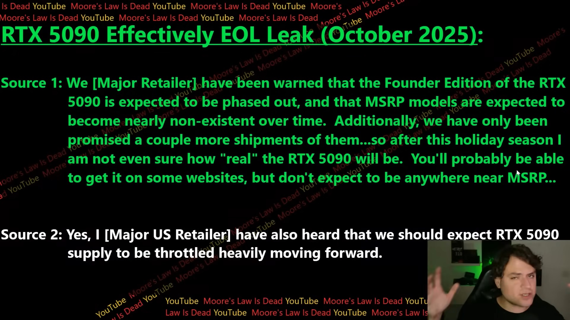 Volgens een MLID-bron die bij een "Major Retailer" werkt, wordt de RTX 5090 Founders Edition "naar verwachting uitgefaseerd". De levering van andere MSRP-modellen lijkt ook te worden teruggebracht tot het punt van niet-bestaan. De bron waarschuwde dat na de vakantie van 2025 de redelijk geprijsde RTX 5090-modellen, zoals de modellen die op of dichter bij de MSRP worden verkocht, waarschijnlijk uit de roulatie zullen zijn.