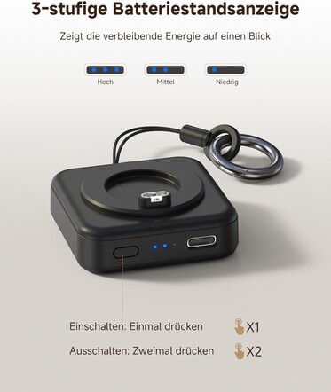 De oplader is zo ontworpen dat hij praktisch is om aan een sleutelbos of in een rugzak te dragen, en om een smartwatch op te laden tijdens kortere reizen zonder dat u de oplader thuis uit het stopcontact hoeft te halen of onderweg naar een geschikte USB-aansluiting hoeft te zoeken. Zodra de 1.200 mAh batterij leeg is, kan deze worden opgeladen via een USB-C kabel. De lader meet 5 x 5 x 2 centimeter en weegt 44 gram.