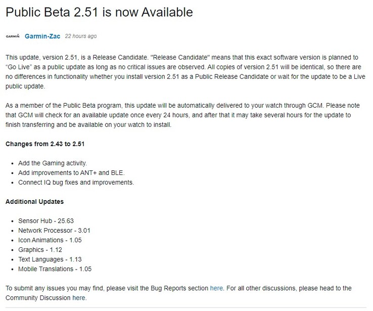 Als je bugs vindt in softwareversie 2.51, vraagt Garmin deze te melden in het gedeelte Bug Reports van het forum; op het moment van schrijven zijn er nog geen problemen gemeld. De firmware is een Release Candidate, wat betekent dat het bedrijf verwacht binnenkort een identieke openbare versie uit te brengen voor alle Venu 2 Sq toestellen, ervan uitgaande dat er geen belangrijke problemen worden gevonden. Als je wilt deelnemen aan het bètaprogramma, kun je dat doen via Garmin Connect.