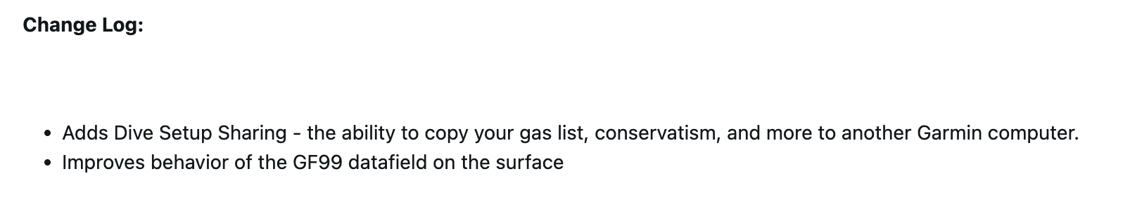 Van systeemsoftwareversie 25.21 wordt ook gezegd dat deze verbeteringen biedt voor de Gradient Factor 99% (GF99) gegevens van de Descent G2. In de release notes geeft Garmin aan dat het gedrag van deze metriek aan de oppervlakte is verbeterd, hoewel verdere details niet worden gegeven.