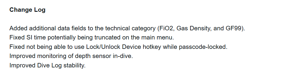 Systeemsoftware versie 2.07 brengt nieuwe technische gegevensvelden voor de Descent X30. Dit zijn de Fraction of Inspired Oxygen (FiO2), Gasdichtheid en GF99. In een bericht op op het Garmin Forumgeeft het bedrijf aan dat het de dieptecontrole tijdens de duik heeft verbeterd via de sensor van het apparaat. Bovendien zou de stabiliteit van de duikcomputer Dive Log geoptimaliseerd zijn.