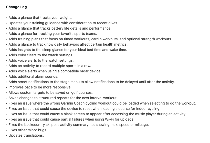 Gebruikers van de Forerunner 570 en Forerunner 970 kunnen nu aangepaste doelen opslaan op golfbanen en wijzigingen opslaan voor gestructureerde herhalingen, klaar voor hun volgende intervaltraining. Garmin heeft een probleem opgelost waarbij de verkeerde Garmin Coach fietstraining werd geladen. Bovendien zijn er updates voor de vertaalfunctionaliteit van de smartwatch.