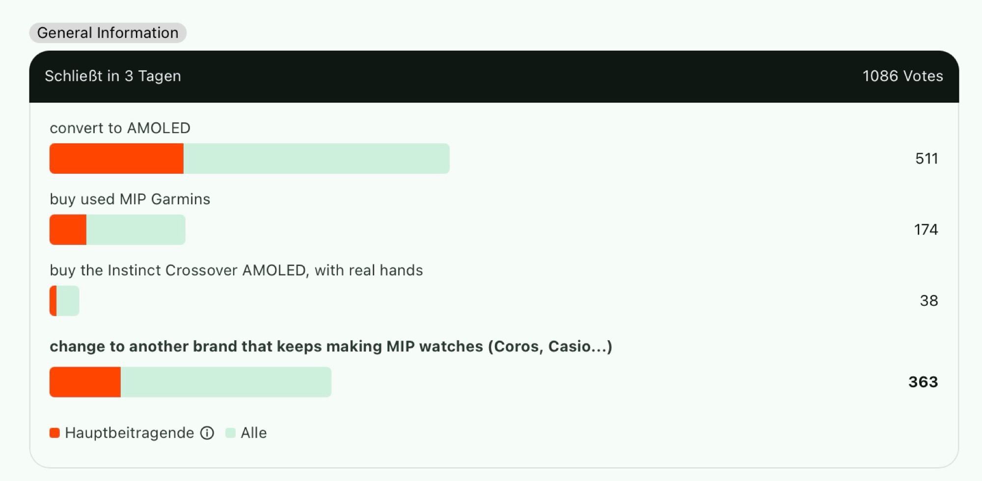 Uit een enquête op Reddit blijkt dat van de 1.086 respondenten in totaal 537 klanten een ouder model met MiP-display zouden kopen of zouden overstappen naar een ander merk als Garmin MiP zou opgeven. Slechts 511 klanten zouden overwegen om over te stappen op een model met een AMOLED-scherm. 38 respondenten zouden in plaats daarvan kiezen voor de Instinct Crossover, die een AMOLED-scherm combineert met wijzers