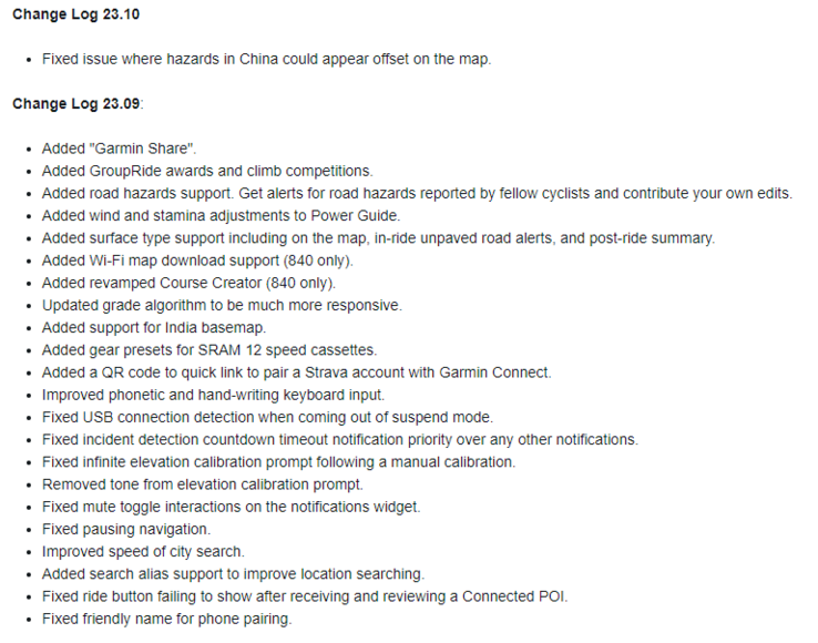 Volgens de changelog voor versie 23.10 is een bug in de nieuwe weggevarenfunctie, die met update 23.09 werd geïntroduceerd, verholpen. Dit betrof gebruikers in China, waarbij gevaren "scheef" op de kaart verschenen. Het lijkt er niet op dat dit probleem problemen veroorzaakt voor gebruikers in andere landen. Update 23.09 kwam eind juni uit en bracht verschillende nieuwe functies naar het toestel, zoals Garmin Share, GroupRide awards en een verbeterde Power Guide.
