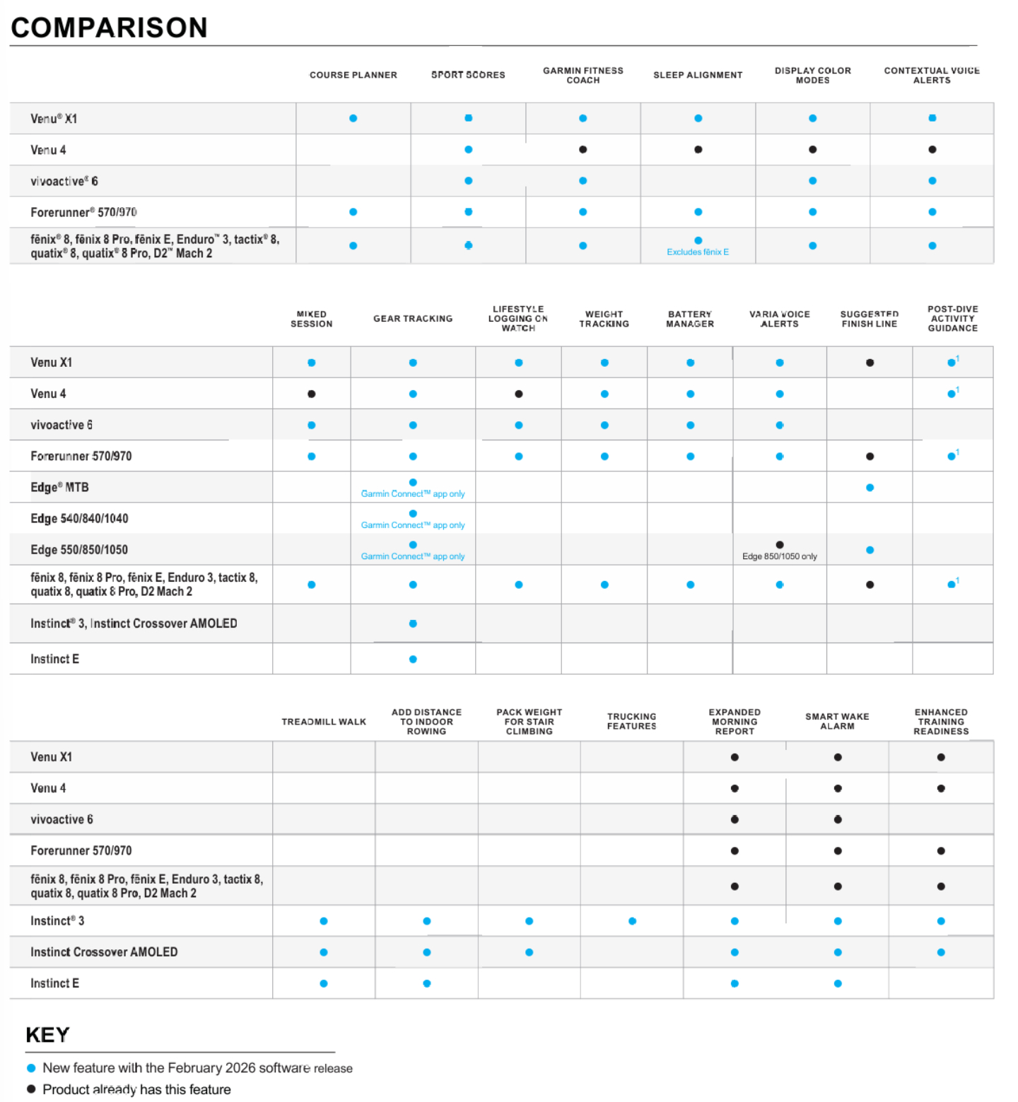 Het is dus mogelijk dat sommige functies in de onderstaande grafieken en vergelijkingstabel al op sommige smartwatches beschikbaar zijn. Ter referentie: Garmin heeft de volgende smartwatches opgenomen in de functie-update van februari 2026:
