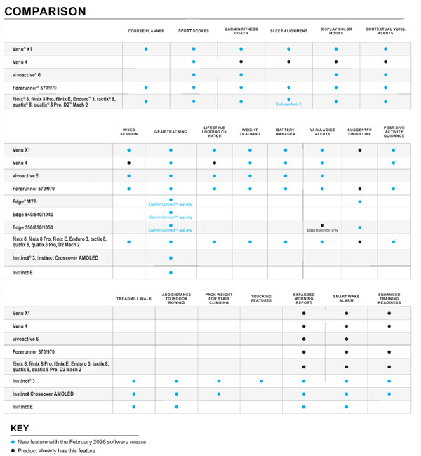 De vergelijkingstabel laat zien dat er nog meer nieuwe functies aan zitten te komen, waaronder Battery Manager en Expanded Morning Report voor de Instinct 3 serie. Garmin zal deze nieuwe functies geleidelijk introduceren en heeft geen vaste tijdlijn aangegeven wanneer de uitrol van de February 2026 Feature Update zal eindigen. Zie de afbeeldingen hierboven en hieronder voor meer details.