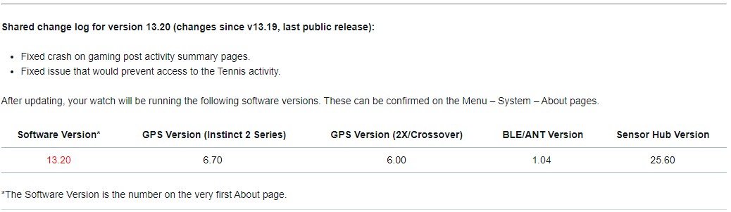 Garmin heeft Publieke update versie 13.19 uitgebracht en Beta versie 13.20 voor de Instinct 2, Instinct 2S, Instinct 2X en Instinct Crossover smartwatches. Software v13.19 is nu beschikbaar voor alle wearables en voegt een Gaming activiteit, Tides Glance en Workouts app toe aan de horloges. De update verhelpt ook problemen met de Bluetooth-sensoren, locatienamen op kaarten en discrepanties in gegevens.