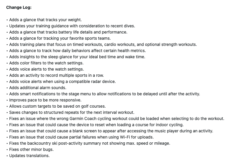 Garmin heeft een reeks nieuwe trainingsplannen toegevoegd voor getimede trainingen, cardiotrainingen en krachttrainingen. Er zijn extra instellingen voor kleurenfilters en gesproken waarschuwingen, evenals meer alarmgeluiden. Bovendien kunnen slimme meldingen nu worden gepauzeerd tot na uw activiteit, een functie die u kunt bedienen via het stappenmenu. De update pakt ook bugs aan die te maken hebben met indoor cycling, de muziekspeler en Wi-Fi uploads. Het volledige wijzigingslogboek vindt u in de schermafbeelding hieronder.