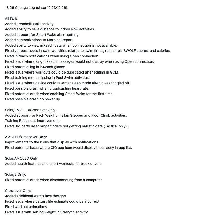 Nieuw in versie 13.26 voor de Instinct 3 en Instinct E smartwatch is een bugfix om te voorkomen dat de wearables vastlopen bij het opstarten. Voor gebruikers van de modellen Solar Tactical en AMOLED Tactical(momenteel $599,99 bij Amazon) heeft het bedrijf een probleem opgelost waarbij laserafstandsmeters van derden geen ballistische gegevens ontvingen zoals verwacht. Bovendien krijgen alle Solar- en AMOLED-horloges nieuwe gezondheidsfuncties en korte workouts die ontworpen zijn voor vrachtwagenchauffeurs. Helaas wordt er in het wijzigingslogboek (hieronder) geen verdere informatie gegeven over deze hulpmiddelen.