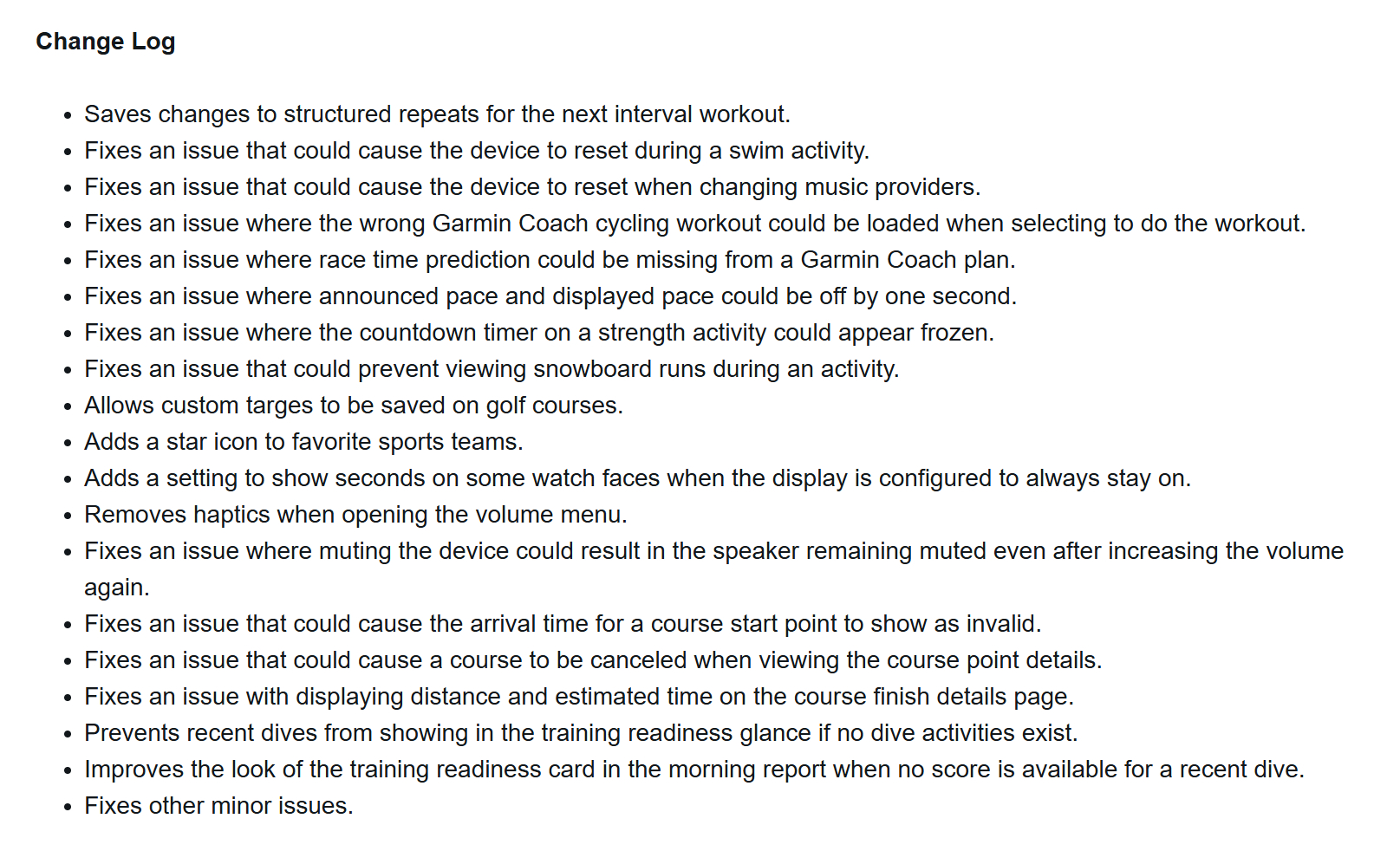 Bètaversie 16.14 richt zich op verbeteringen en bugfixes voor deze nieuwere Forerunner smartwatches. In de release notes staat dat uw favoriete sportteams nu gemarkeerd worden met een sterpictogram, en er is een nieuwe instelling waarmee gebruikers seconden kunnen bekijken op sommige wijzerplaten met altijd-aan display. Voor duikers is de weergave van de sectie Training Readiness van het Morning Report verbeterd als er geen recente duikscore is. Bovendien kunnen golfers nu aangepaste doelen opslaan op golfbanen.