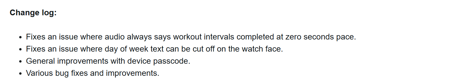 Er zijn ook twee bugfixes in deze bètaversie. De eerste lost een probleem op waarbij de weekdagtekst op sommige wijzerplaten werd afgesneden. De tweede lost een audiogerelateerd probleem op tijdens trainingen; bij een tempo van nul seconden gaf de audio aan dat de trainingsintervallen voltooid waren. Tot slot staat er in de release notes dat er andere, waarschijnlijk kleinere, bugfixes en verbeteringen zijn.