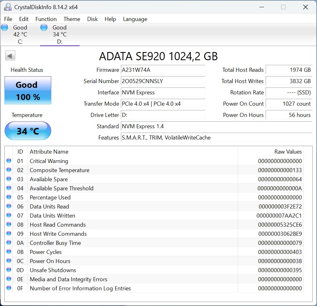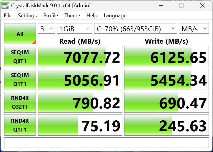 De Geekom A7 Max maakt gebruik van een 1 TB SSD met een PCIe 4.0 aansluiting, die fatsoenlijke, zo niet uitstekende overdrachtssnelheden haalt. Voor alledaagse taken en productieve workloads zijn de geboden opslagprestaties echter ruim voldoende. De koeling van de schijf is zo ontworpen dat de prestaties stabiel blijven, zelfs bij langdurige belasting.