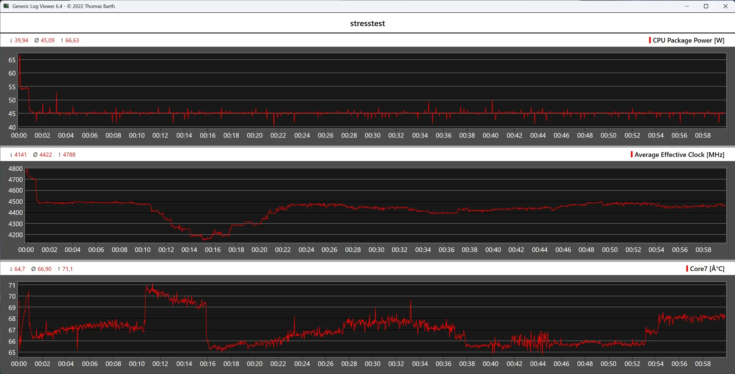 De behuizing van de Geekom A7 Max blijft zowel in ruststand als onder belasting aangenaam koel. In de stresstest bereikt de geïnstalleerde AMD Ryzen 9 7940HS kortstondig temperaturen van rond de 71 °C, wat niet kritiek is. Het koelsysteem kan de permanent toegepaste TDP van 45 watt betrouwbaar afvoeren.