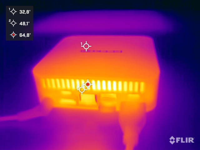 De aluminium behuizing blijft relatief koel en komt tijdens de stresstest slechts af en toe boven de 40 °C uit. Geekom heeft een uitgekiend koelconcept voor de A7. Verse lucht wordt aan de zijkanten aangezogen en direct aan de achterkant uit de behuizing geblazen. Hierdoor zien we de warmste plekken aan de achterkant. De piektemperatuur van AMD Ryzen 9 7940HS bereikte 95,3 °C in de stresstest met Prime95. In het begin bereikt de SoC kortstondig 60 watt, wat ook resulteert in de maximale temperatuur. Naarmate de test vordert, moet het stroomverbruik worden afgeremd, waarna de processor afvlakt naar 35 watt. De CPU-temperatuur daalt echter slechts licht tot net onder de 90 °C.