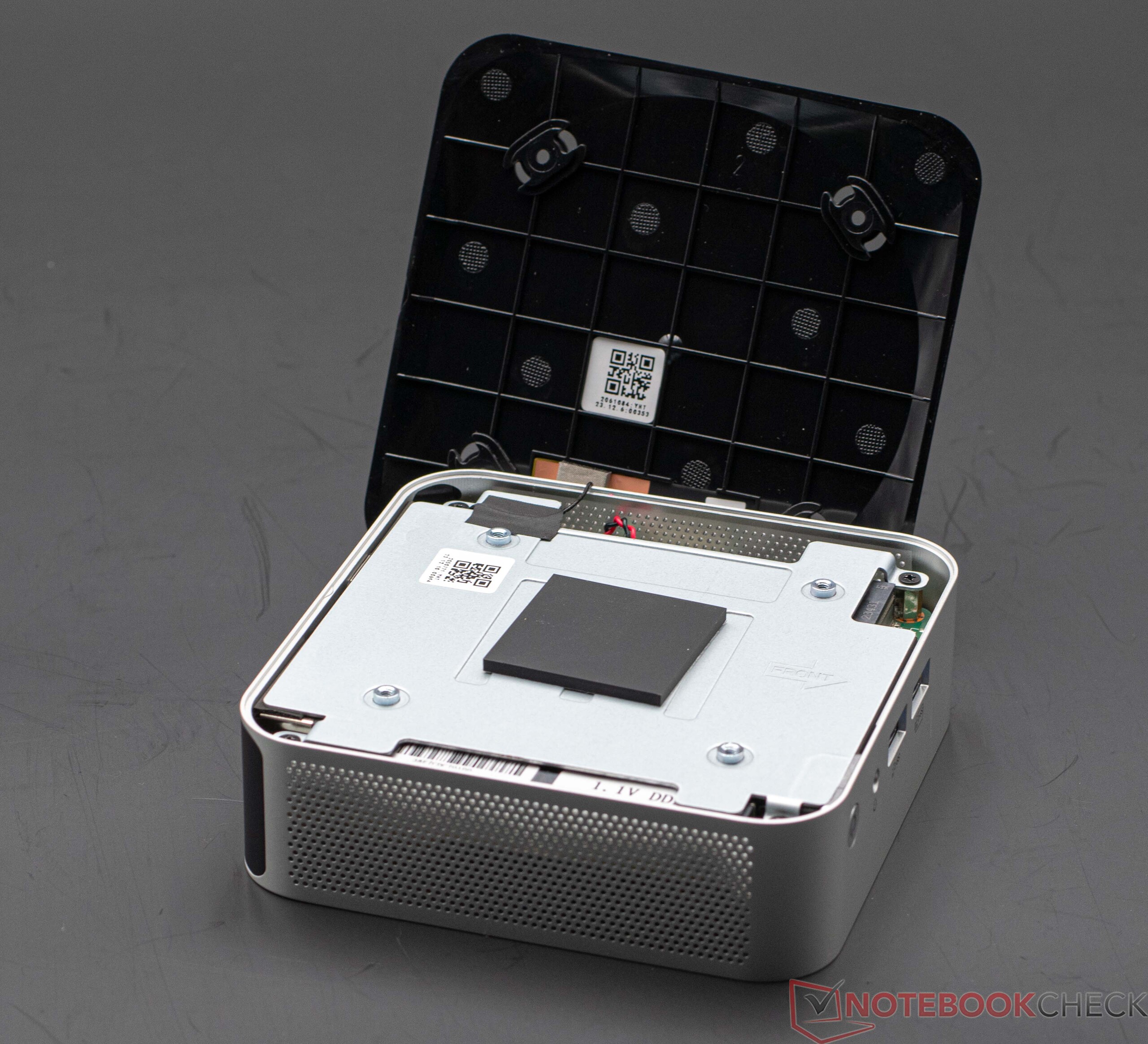 Door het uiterst compacte ontwerp wordt het onderhoud tot een minimum beperkt. Bovendien wordt de Geekom A7 altijd voorgeconfigureerd met RAM en SSD geleverd. Als u echter het RAM of de massaopslag wilt vervangen, dan kan dat nog steeds, aangezien de componenten verwijderbaar zijn. De schroeven aan de onderkant zitten verborgen onder de vastgelijmde rubberen voetjes. Zoals zo vaak het geval is, bestaat het risico dat de rubberen voetjes na verwijdering niet meer goed vastzitten. Zodra de vier schroeven zijn losgedraaid, kan de bodemplaat gemakkelijk worden verwijderd. U moet echter nog steeds voorzichtig zijn, aangezien de WLAN-antennekabel niet veel manoeuvreerruimte biedt. De geïnstalleerde componenten zijn vervolgens gemakkelijk toegankelijk onder een andere metalen plaat. Onder andere de WLAN-module kan indien nodig ook worden vervangen. De hele printplaat, inclusief de koeleenheid, moet verwijderd worden om de CPU ventilator schoon te maken. Deze zit op zijn beurt met vier schroeven vast in de behuizing. Het verwijderen van de printplaat is zeer eenvoudig en kan zonder speciaal gereedschap worden uitgevoerd.