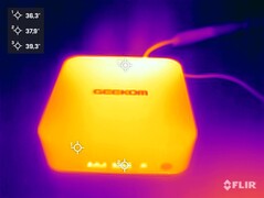 De aluminium behuizing van de Geekom A8 warmt merkbaar op bij stationair draaien. Dit is echter geen probleem, hoewel de temperatuur onder belasting slechts minimaal stijgt. De oppervlaktetemperaturen dalen soms zelfs, wat erop wijst dat de ventilator nauwelijks werkt bij stationair draaien en er dus meer warmte in het apparaat zelf wordt opgebouwd.