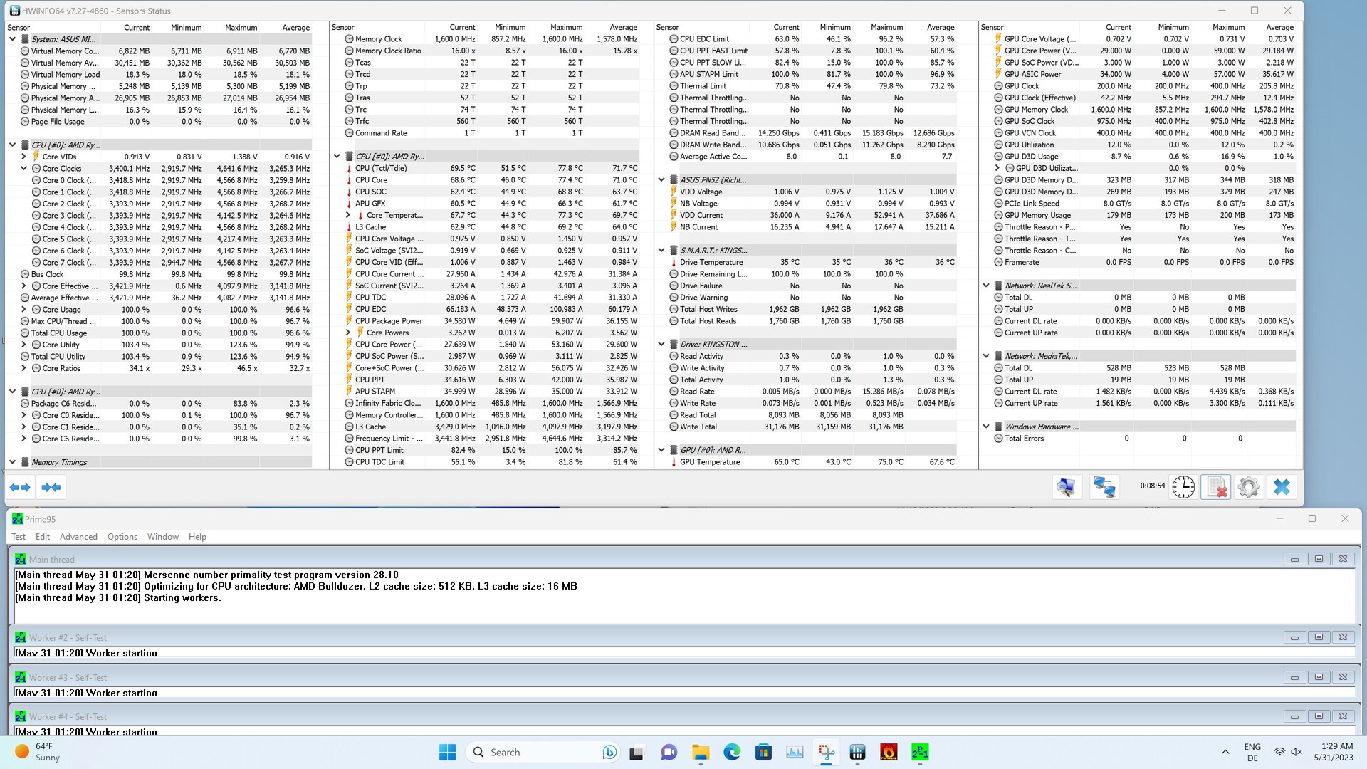 In de Prime95 stresstest bereikte de AMD Ryzen 9 5900HX slechts 77,8 °C, wat betekent dat de SoC nog veel ademruimte heeft voordat hij zijn thermische grenzen bereikt. Toen we tegelijkertijd de CPU en de iGPU belastten, zagen we slechts marginaal lage temperaturen omdat beide componenten de gecombineerde TDP van maximaal 54 watt moeten delen.