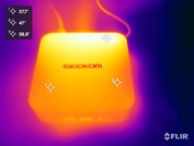 De behuizing van de Geekom GT13 Pro warmt merkbaar op, zowel stationair als onder belasting. Onder belasting lopen de oppervlaktetemperaturen weer iets op. De 50 °C wordt echter niet helemaal bereikt. We registreren relatief hoge temperaturen met de Intel Core i9-13900H, wat te wijten is aan de slechte ventilatie van de compacte koeleenheid. Bij 100 °C bereikt de SoC de maximale waarde die Intel zelf in de specificaties vermeldt. Het is belangrijk om te weten dat de 100 °C slechts korte tijd wordt bereikt. De CPU-temperatuur daalt licht wanneer de PL1 op maximaal 35 watt werkt. Gemiddeld ligt de temperatuur van de Intel Core i9-13900H rond de 90 °C.