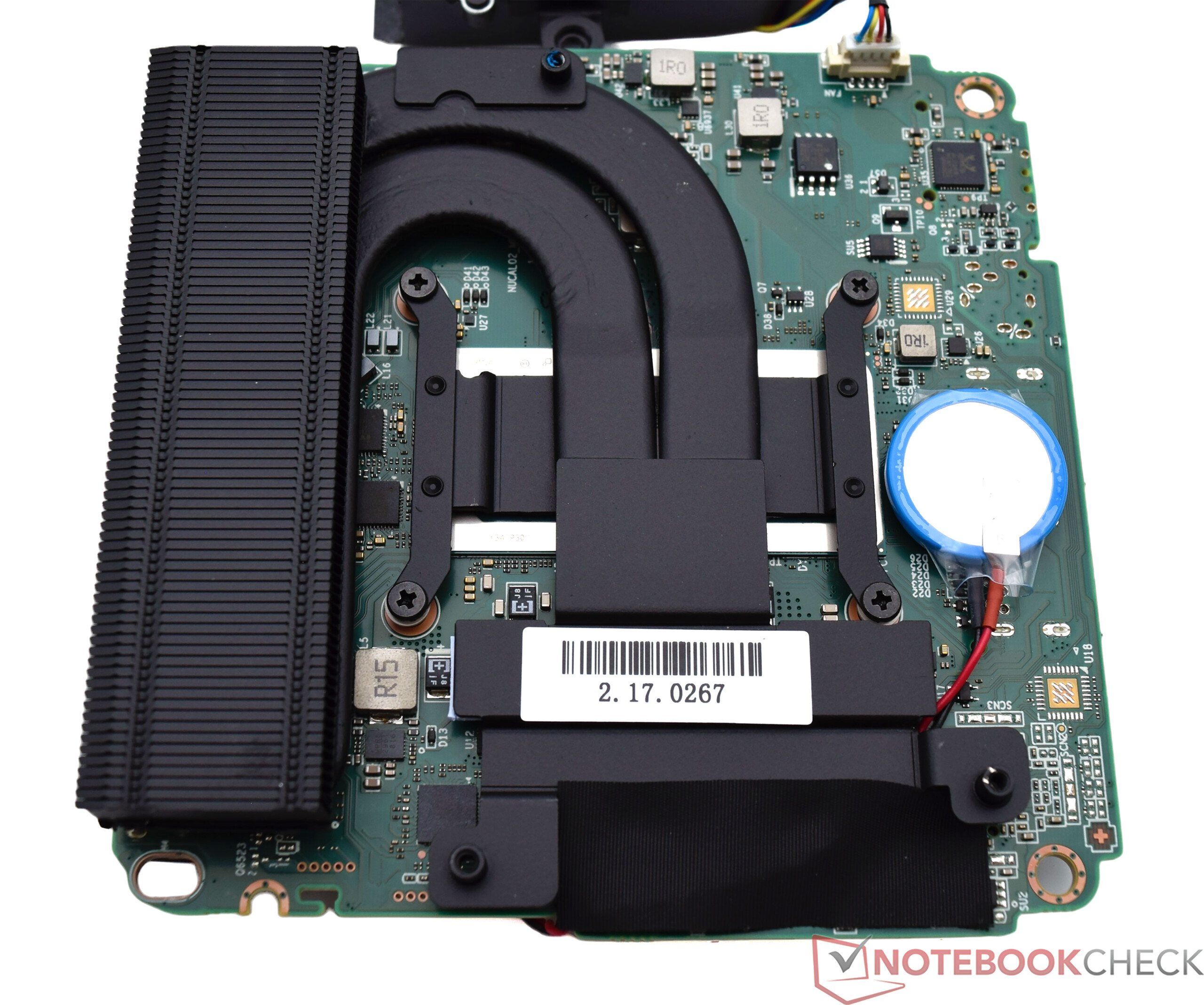 De Geekom GT13 Pro wordt altijd samen met RAM en SSD verkocht. Dit betekent dat het apparaat niet per se geopend hoeft te worden om ontbrekende hardwarecomponenten te installeren, zoals het geval is bij barebone-varianten. Als u toch bij de binnenkant moet komen, kunt u de Geekom GT13 Pro vanaf de onderkant openen. Vier schroeven zitten verborgen onder de vastgelijmde rubberen voetjes, die de plastic afdekking vastzetten. Wees hier voorzichtig om de WLAN antennekabel niet te beschadigen. Er zit nog een metalen plaat onder de plastic afdekking, die ook verwijderd moet worden als u bij de SSD of het RAM wilt. De WLAN-module kan ook worden vervangen. Om toegang te krijgen tot de koeleenheid, die door de fabrikant wordt geadverteerd als IceBlast 1.5, moet het bord volledig uit de behuizing worden verwijderd, wat in de praktijk geen grote uitdaging is.