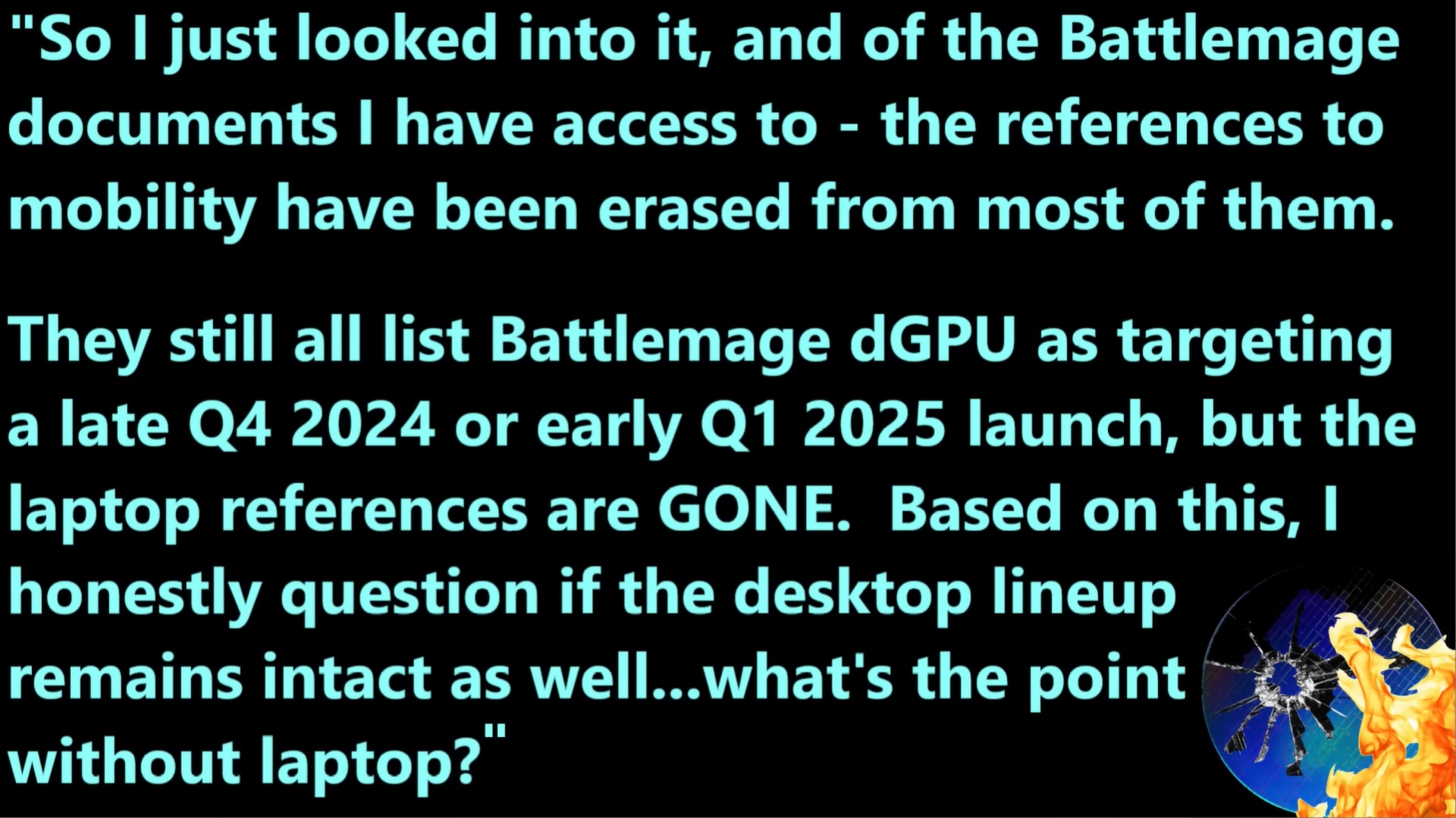 Om meer te weten te komen over de status van de Arc Battlemage voor mobiel, heeft MLID naar verluidt met enkele OEM's van laptops gesproken over de situatie. Alle OEM-bronnen van de leaker ontken iets over Battlemage te hebben gehoord, waarbij één bron suggereerde dat "het al te laat is voor ons om dit jaar nog een notebook met Battlemage te lanceren". De OEM had naar verluidt al "enkele details over RDNA 4 en Blackwell" ontvangen.