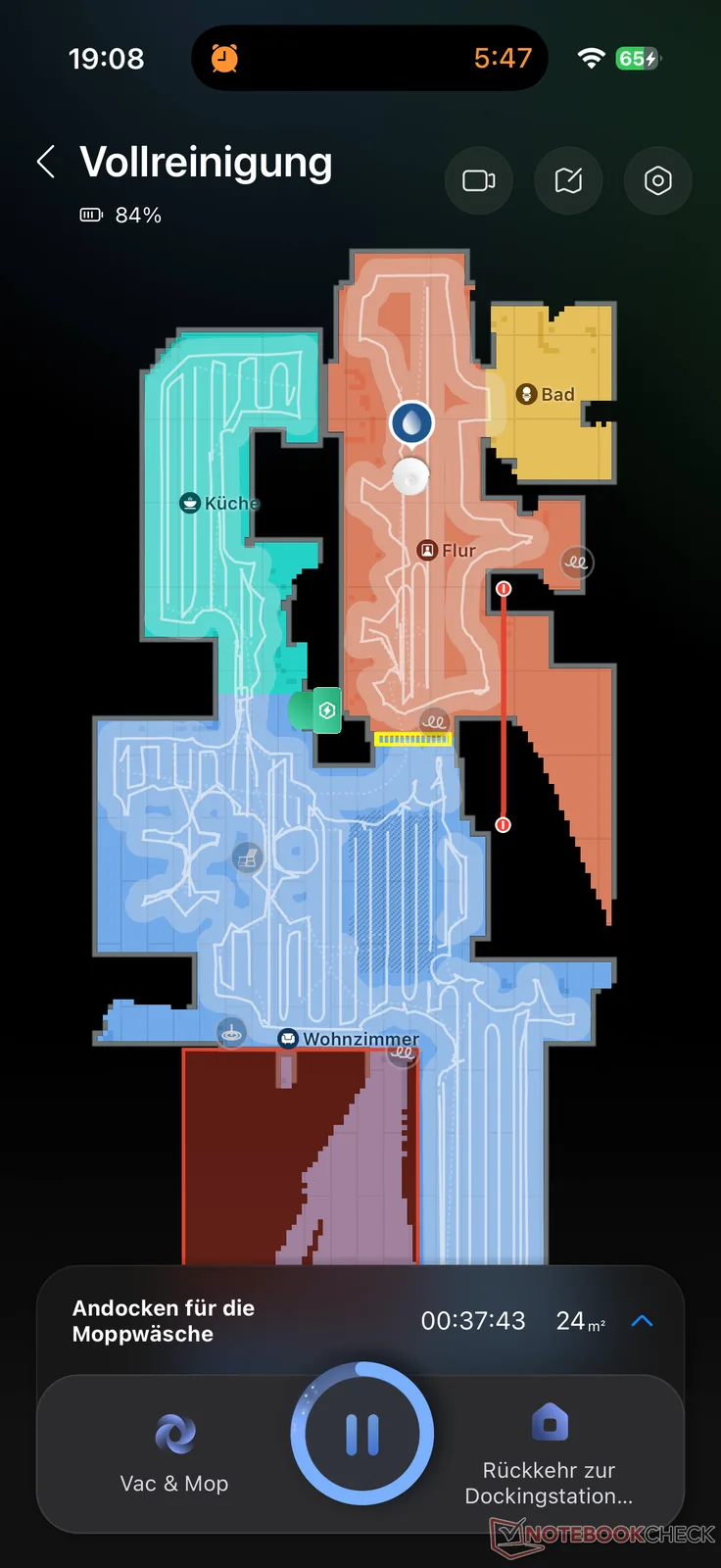 Hierdoor draait hij af en toe een beetje om zich in de ruimte te oriënteren. Dit is natuurlijk enigszins nadelig voor de schoonmaaktijd, die we in meer detail zullen bespreken in onze Roborock Saros 20 test. Over het algemeen presteerde hij niet helemaal perfect, maar wel heel goed. De routeplanning was volledig in alle toegankelijke gebieden, wat een vereiste is voor een goed schoonmaakresultaat.