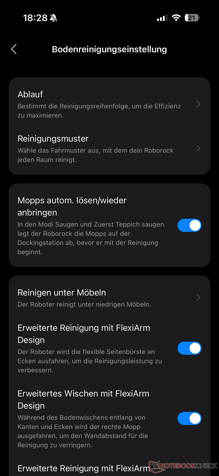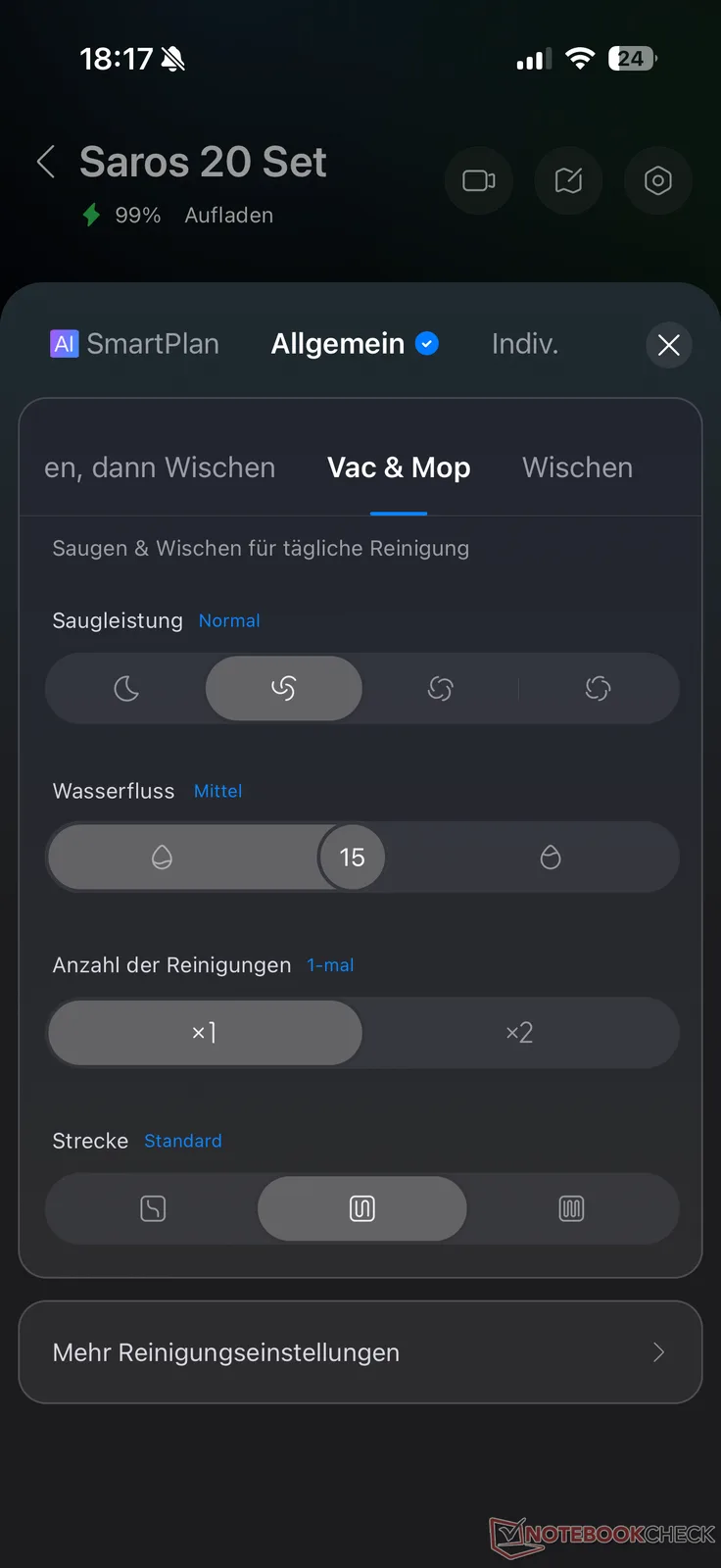 De Roborock-app biedt vier reinigingsopties voor de Saros 20: "Stofzuigen en dweilen", "Eerst stofzuigen, dan dweilen" en "Alleen stofzuigen" en "Alleen dweilen". Voor beide schoonmaakstanden zijn verschillende opties beschikbaar. De zuigkracht kan bijvoorbeeld in de gebruikelijke vier stappen worden ingesteld en de dweilvochtigheid in 30 stappen. AI SmartPlan is ook beschikbaar als alternatief voor de modi. Hierbij past de robot zich steeds beter aan de omstandigheden aan, aangestuurd door AI.