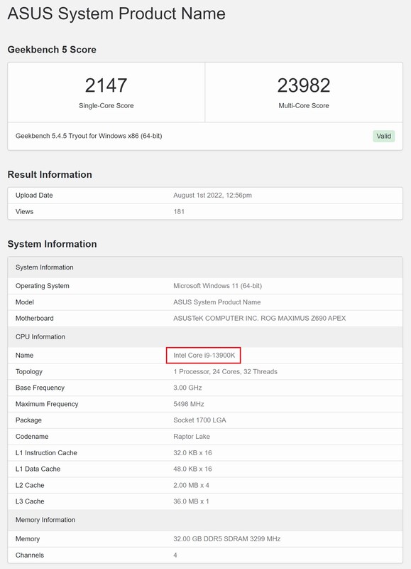 Een paar weken geleden werd de Intel Core i9-13900K een uitstapje gemaakt naar Geekbench, waar hij geklokt werd op maximaal 5,5 GHz, maar in een testrun die als ongeldig werd geclassificeerd. Nu is de aankomende Raptor Lake processor teruggekeerd naar dezelfde benchmarksite en slaagde erin een geldige run uit te voeren die eigenlijk vrij vergelijkbare resultaten opleverde. De single-core score was 2.147 punten en de multi-core score was 23.982 punten, waarbij de i9-13900K opnieuw rond de 5,5 GHz raakte. De Raptor Lake chip maakte deel uit van een Asus systeem dat gebruik maakte van een Asus ROG Maximus Z690 Apex moederbord. Bovendien werd 32 GB DDR5 RAM op 3299 MHz opgenomen als onderdeel van het testresultaat, wat iets sneller is dan de vorige inzending (3200 MHz).