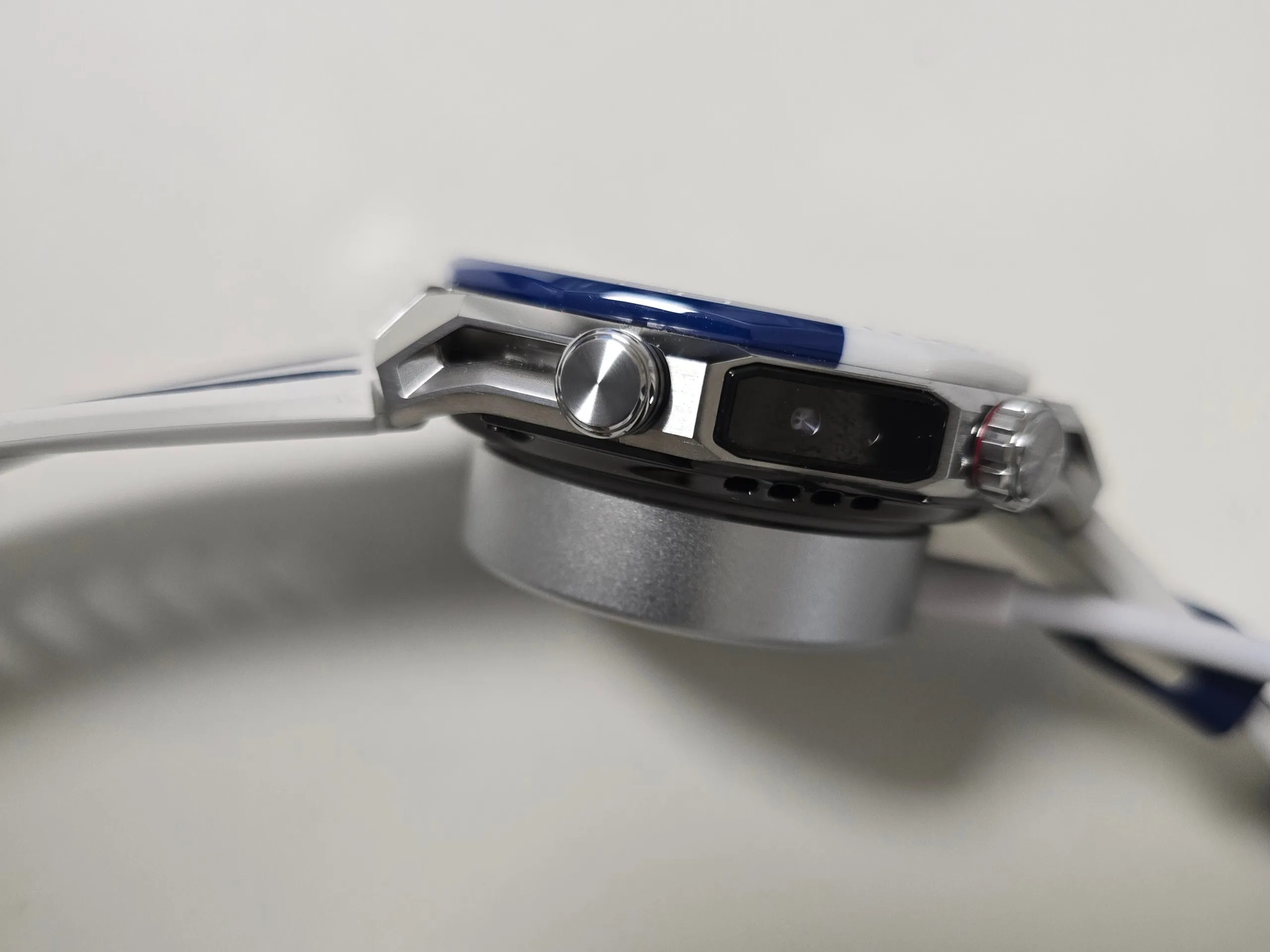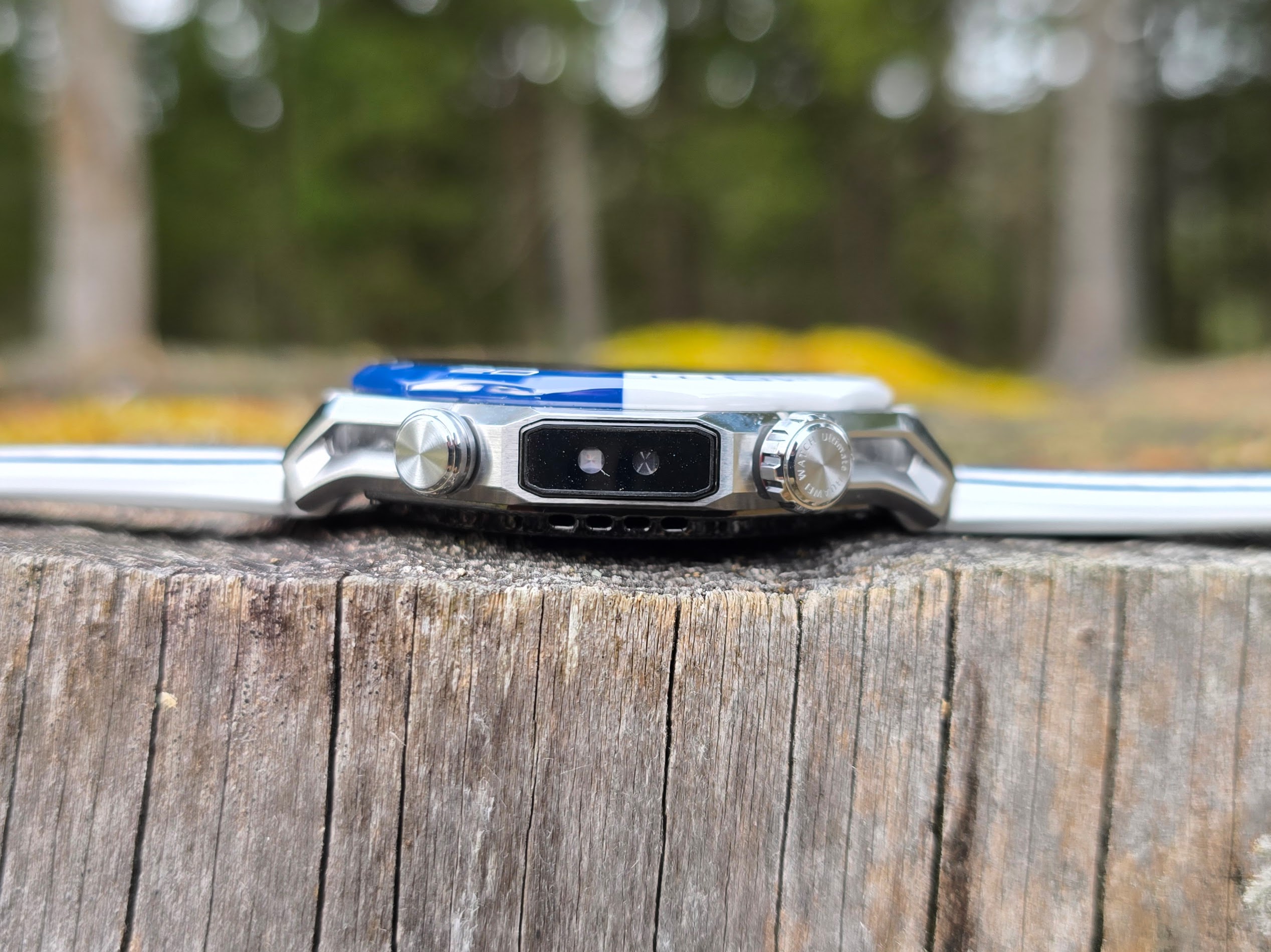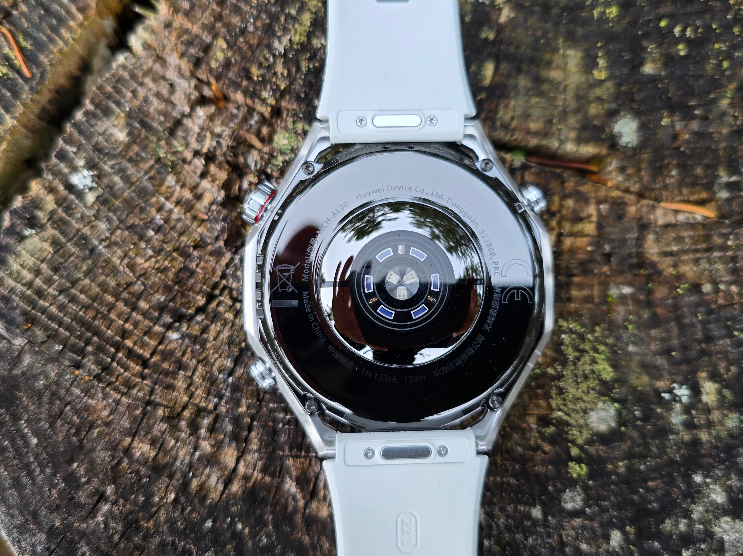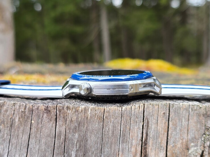 Aan de rechterkant vindt u een draaibare en in te drukken kroon, een knop, een luidspreker en Huawei's X-Tap sensor. Aan de linkerkant vindt u nog een knop en een dieptesensor. De 22 millimeter band kan zonder gereedschap worden verwisseld.