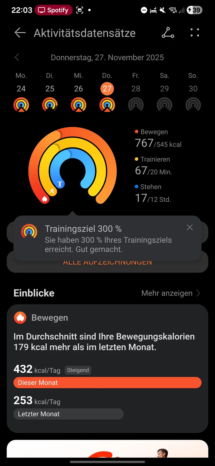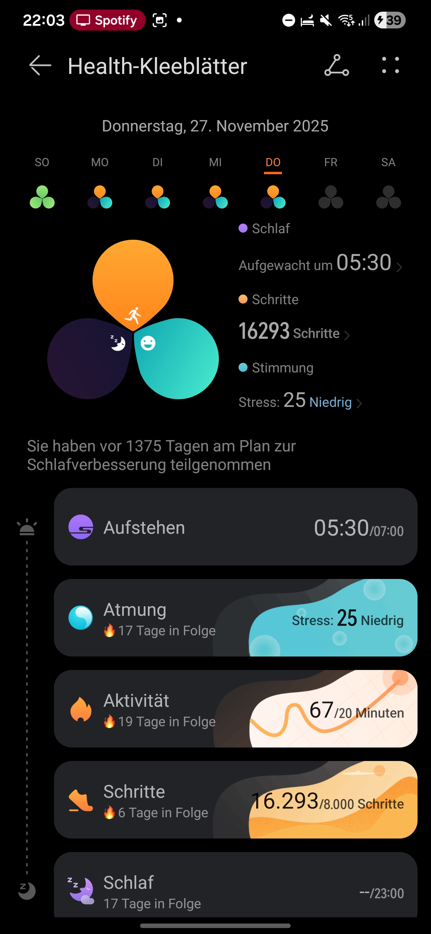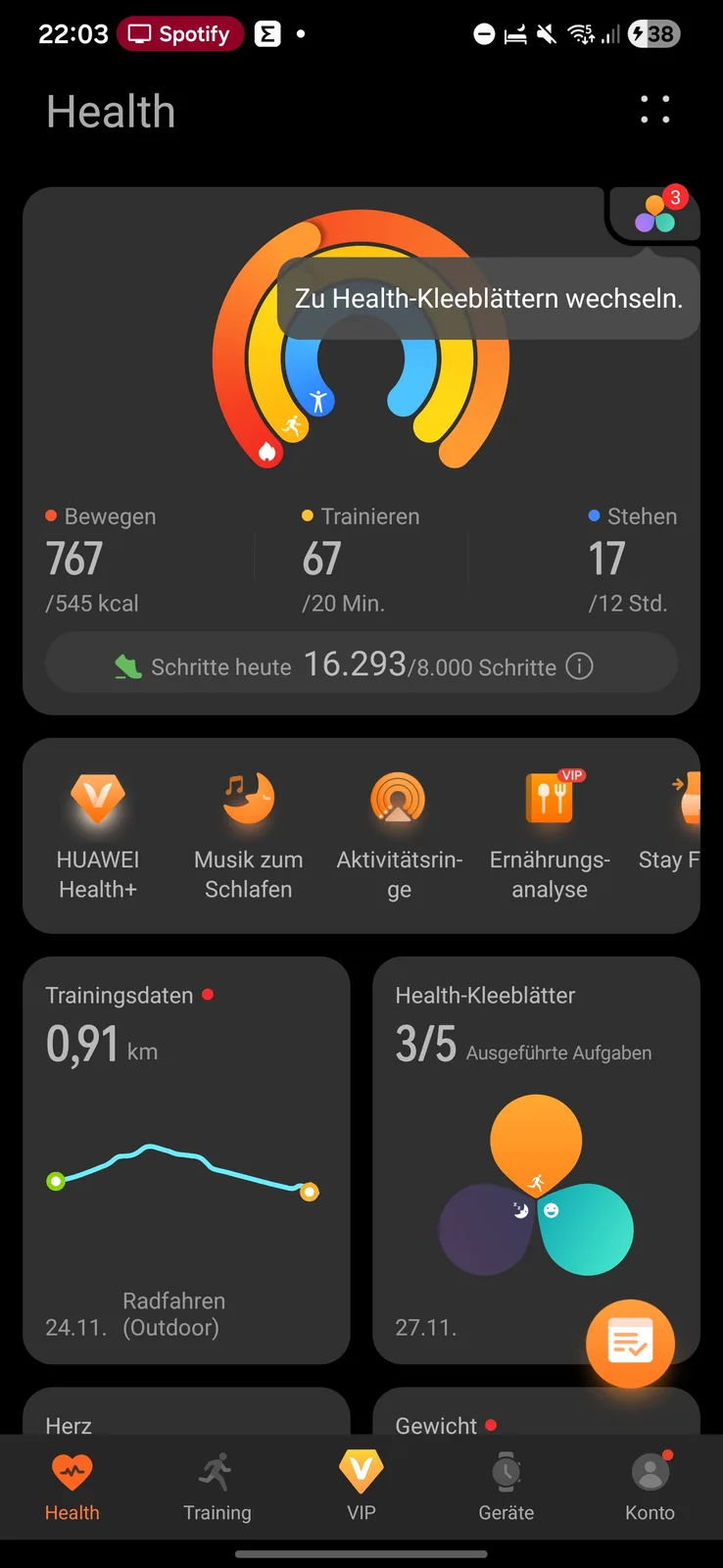 Huawei biedt verschillende visuele indelingen voor activiteitendoelen. Naast de bekende ringen is er ook een klaverbladindeling. De blaadjes vullen zich in de loop van de dag, waarbij de smartwatch dagelijkse patronen bijhoudt en doelen instelt, zoals wakker worden binnen een bepaald tijdsvenster of actief blijven gedurende de dag.