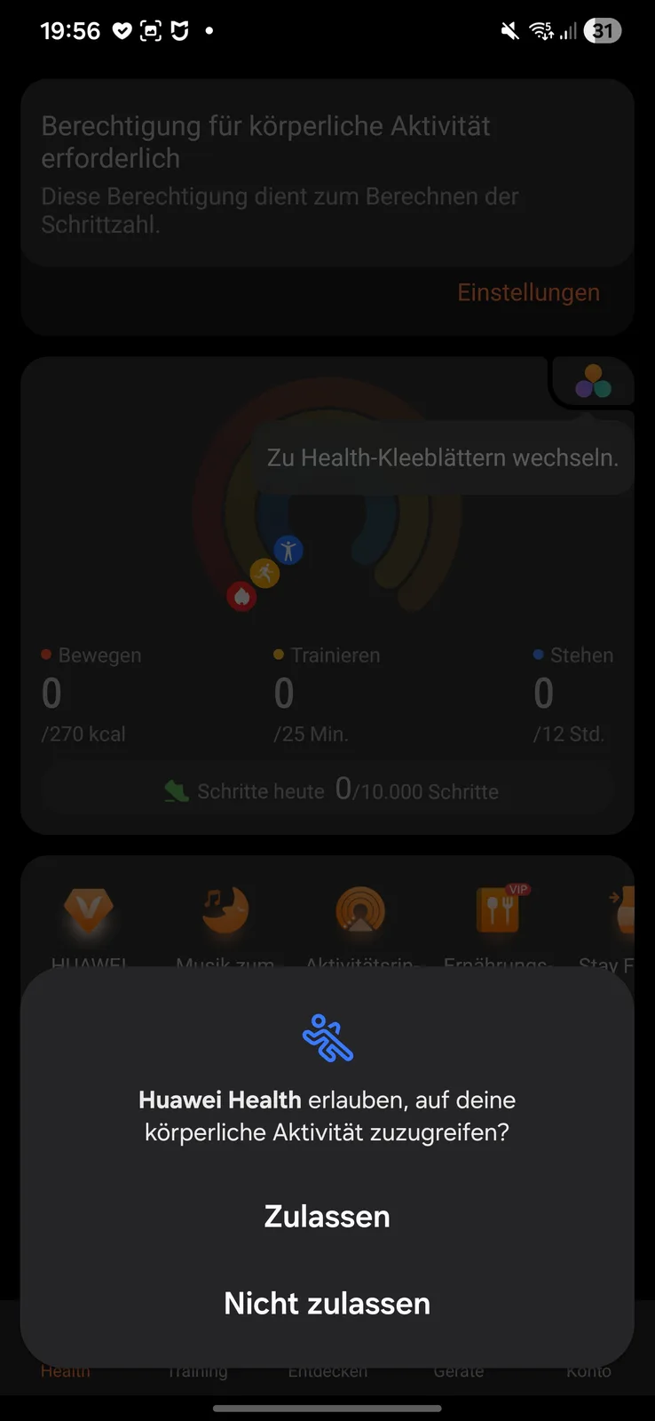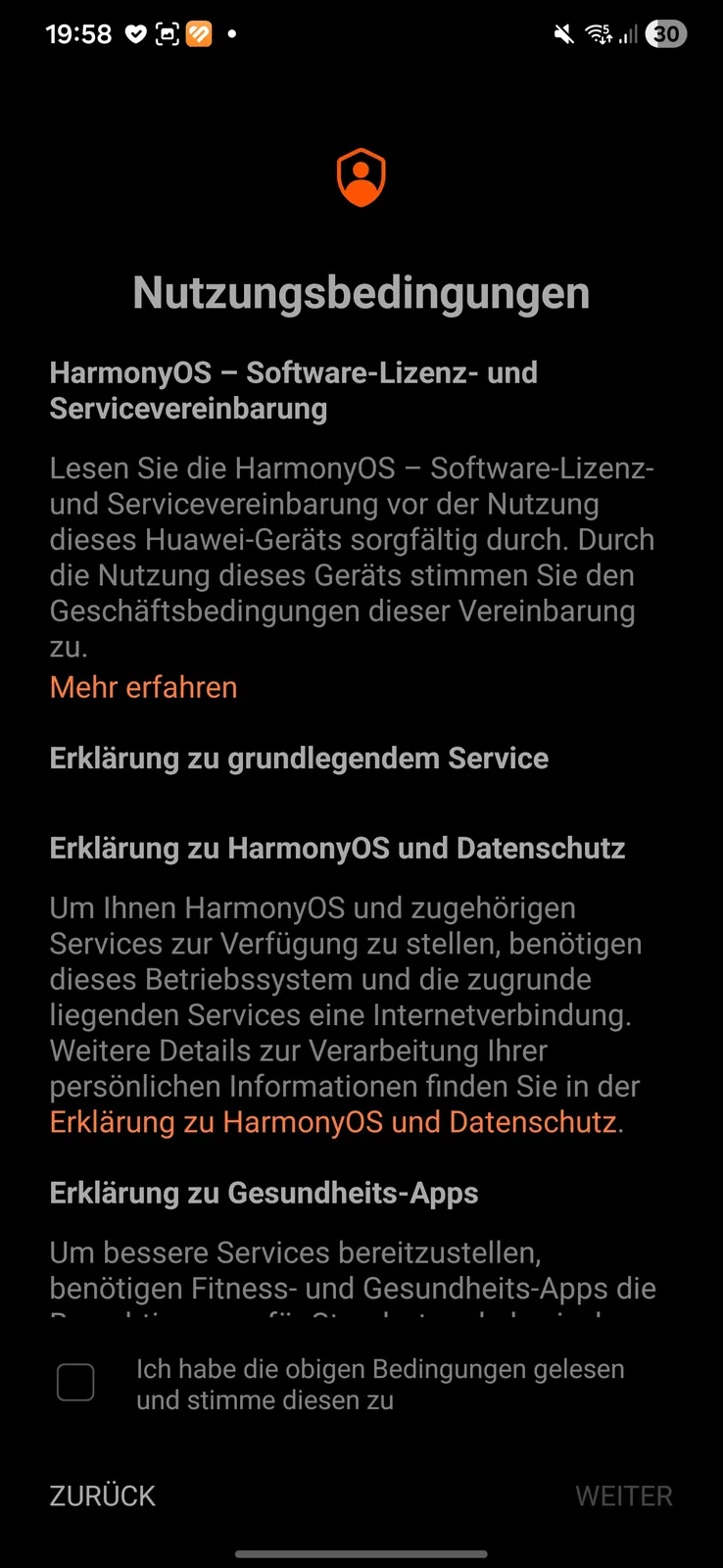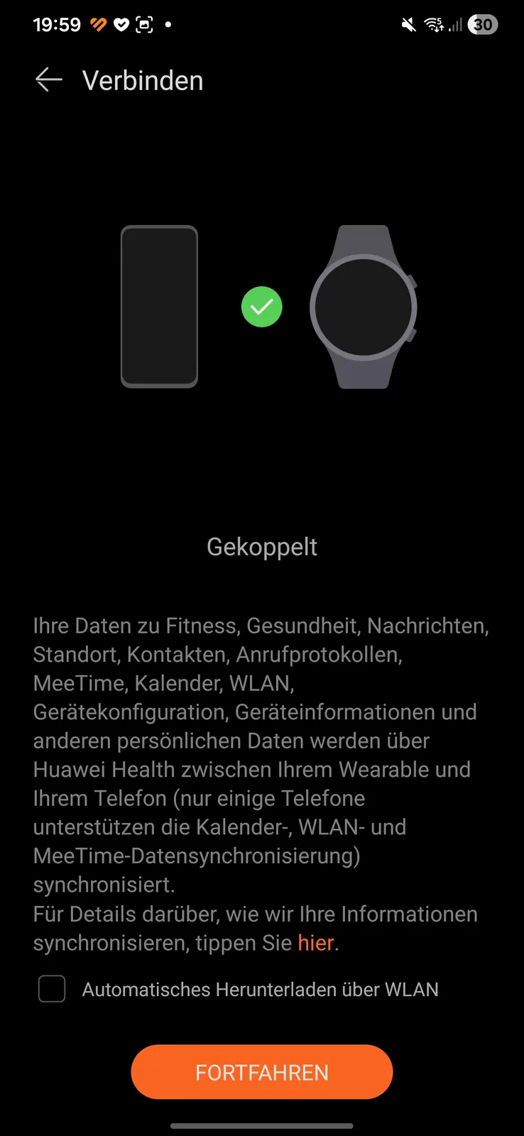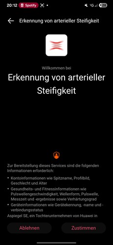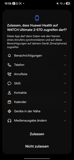 Tijdens het testen werd de smartwatch onmiddellijk gedetecteerd en zonder problemen gekoppeld. Tijdens de installatie moeten er verschillende toestemmingen worden verleend. Een Huawei ID is ook vereist. Aan het einde van het proces start een tutorial op het horloge. Eén ding valt op: voor elke app die op de smartwatch wordt geopend, is een aparte toestemming voor gegevensverwerking nodig.