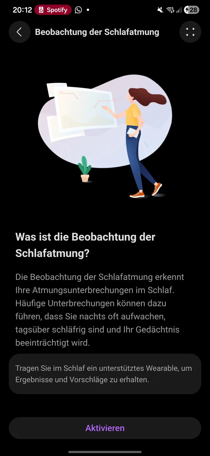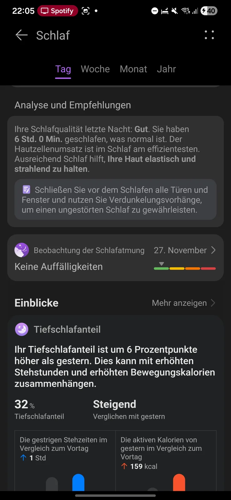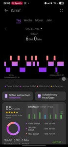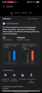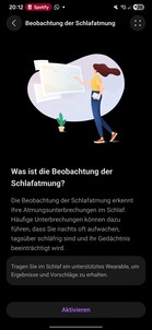 Het horloge houdt ook de continuïteit van diepe slaap, ademhalingskwaliteit, hartslag, zuurstofverzadiging en ademhalingsfrequentie bij. Voor het detecteren van slaapgeluiden is een gekoppelde smartphone in de buurt nodig. De totale slaap wordt beoordeeld met behulp van een score en een sterrensysteem, en de software biedt analyses en aanbevelingen om de slaapkwaliteit te verbeteren.