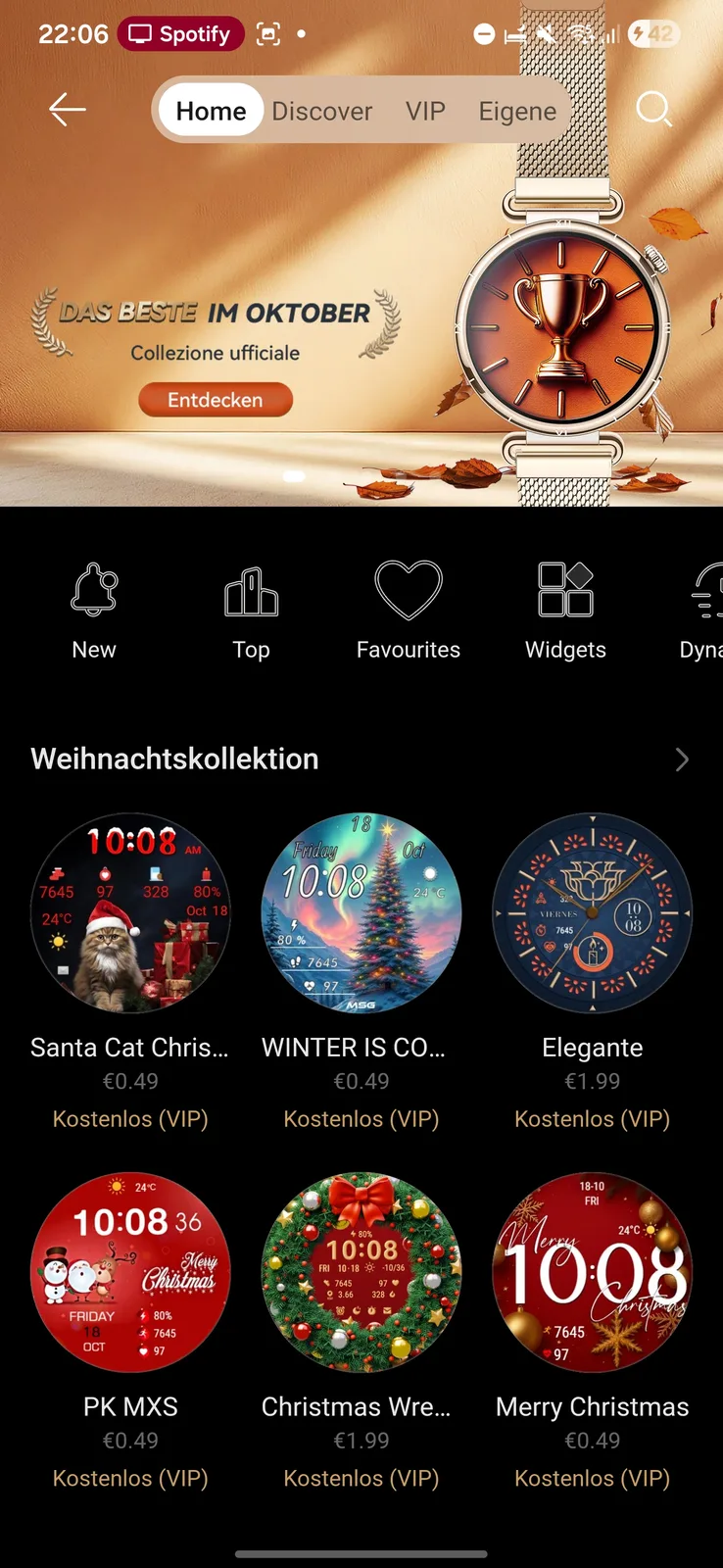 Voltooide workouts verschijnen onder Training. VIP geeft toegang tot het betaalde Plus-niveau. Het tabblad Apparaten bevat instellingen, de AppGallery, muziekbeheer en een grote selectie van wijzerplaten.